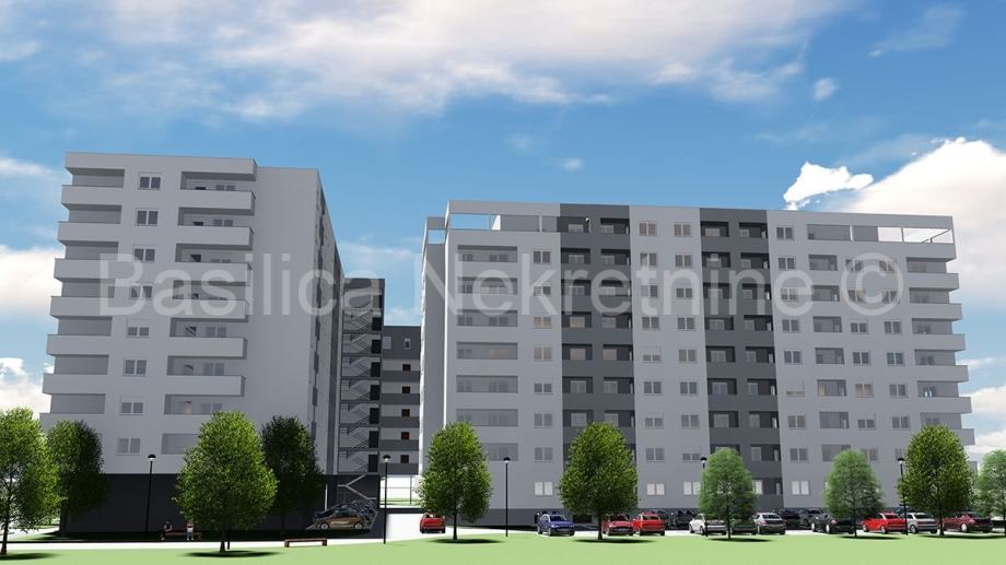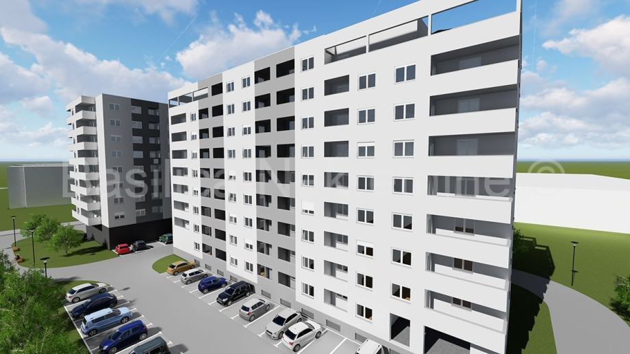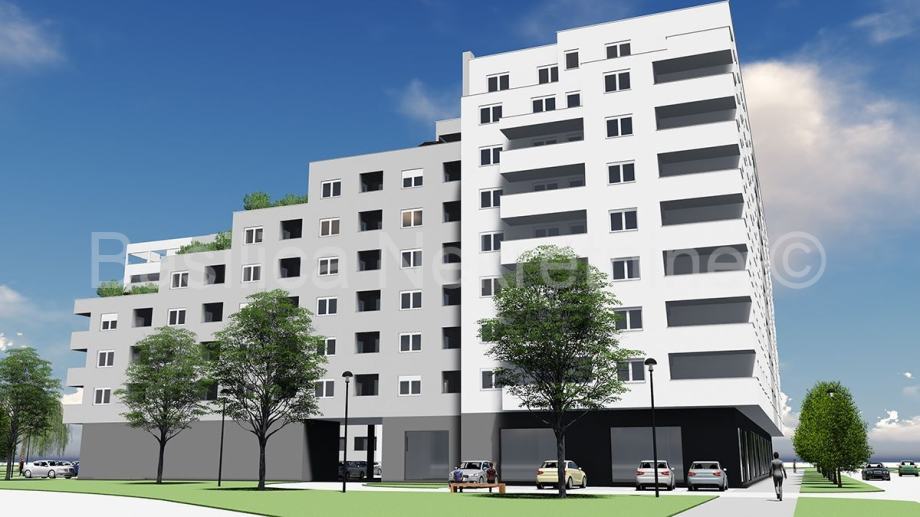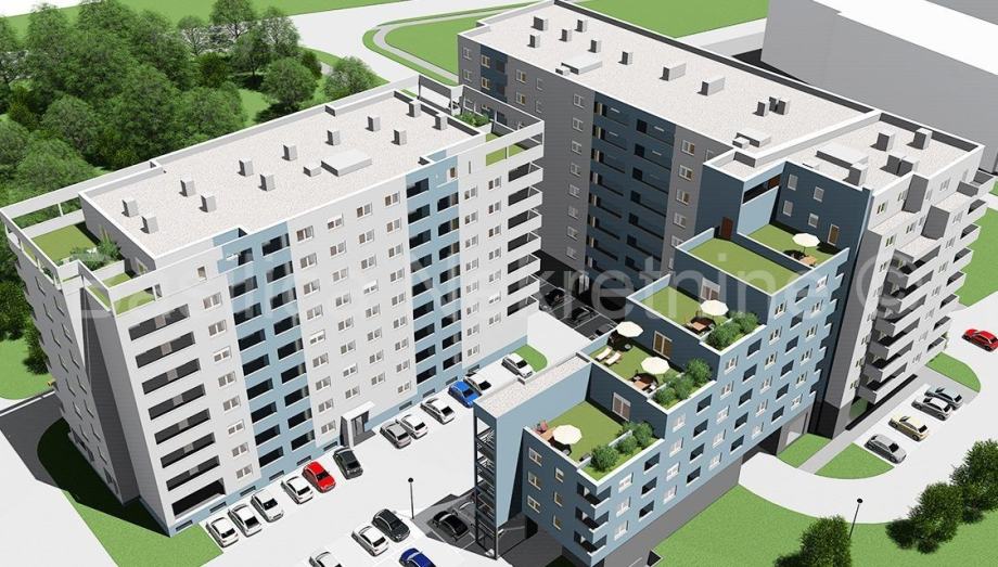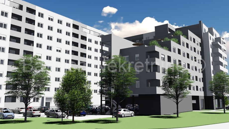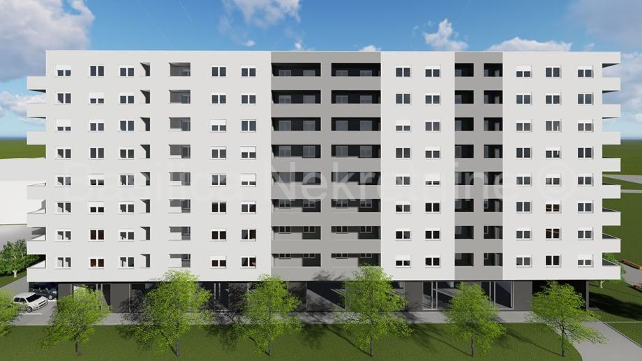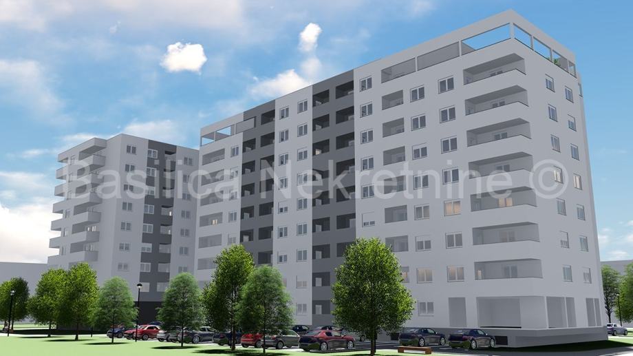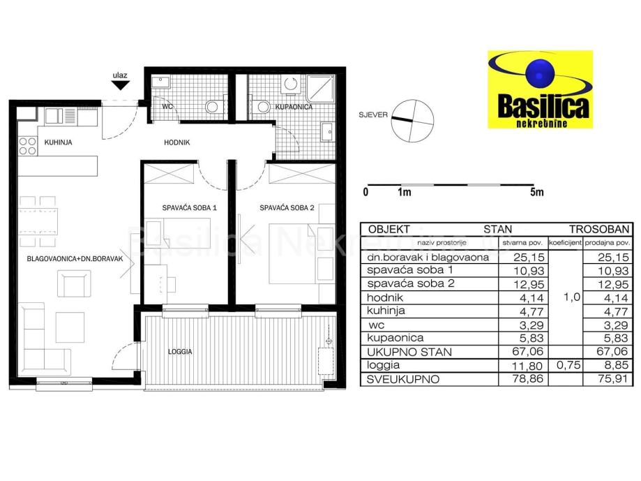 Prodaje se stan na 6. katu zgrade (od ukupno 8 katova), trosoban, Sastoji se od: dnevnog boravka sa kuhinjom i blagovaonicom (29,92m2), kupaonice (5,83m2), wc-a (3,29m2), hodnika (4,14m2), sobe (10,93m2), sobe (12,95m2), ukupne stambene površine 67,06m2, te lođe od 11,8m2 (obračunski 8,85m2) i garažnog parkirnog mjesta (12,74m2 - obračunski 6,37m2). Ukupna prodajna površina je 82,28m2.