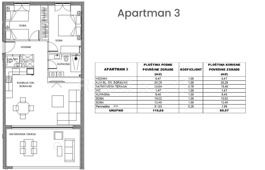 Za vašu udobnost, apartmanu pripadaju dva vanjska parkirna mjesta, ukupne površine 31,9 m2 (obračunski 8 m2), osiguravajući jednostavno i sigurno parkiranje unutar posjeda zgrade.