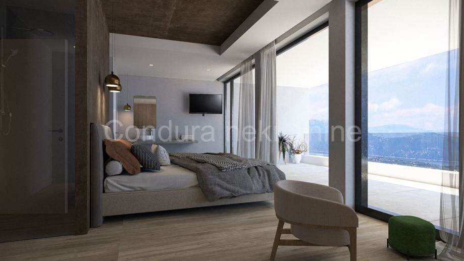 Iz dnevnog boravka i kuhinje s blagovaonicom se kroz velike staklene stijene izlazi na natkrivenu terasu u nastavku koje se nalazi grijani infinity bazen te popločani nenatkriveni dio terase idealan za sunčanje i vrt uređen biljkama.