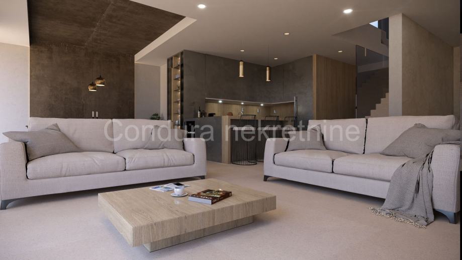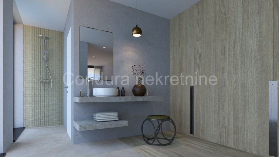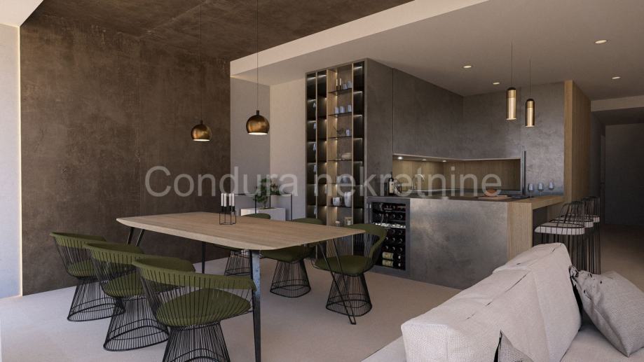 Iz dnevnog boravka i kuhinje s blagovaonicom se kroz velike staklene stijene izlazi na natkrivenu terasu u nastavku koje se nalazi grijani infinity bazen te popločani nenatkriveni dio terase idealan za sunčanje i vrt uređen biljkama. Jedna spavaća soba također ima izlaz u vrt.