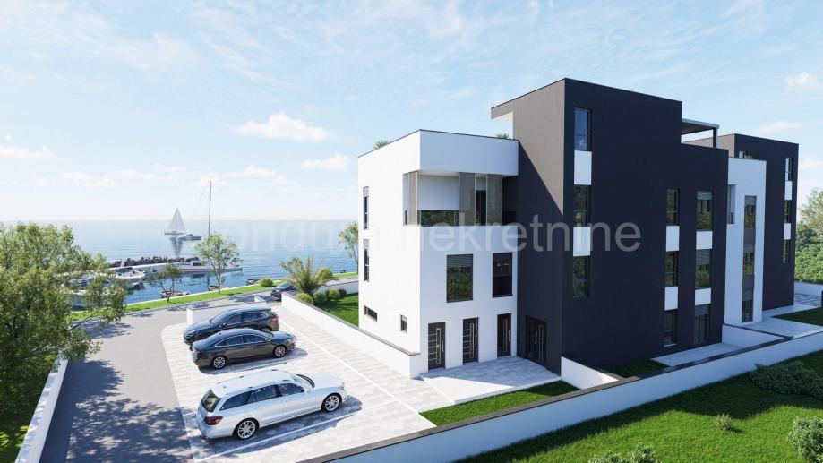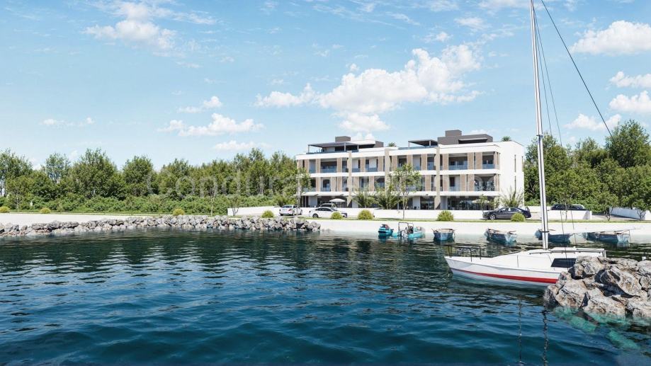 ZATON - na prodaju je luksuzni dvosobni apartman na prvom katu moderne novogradnje s dizalom u 1. redu do mora i plaže, s otvorenim pogledom na more.