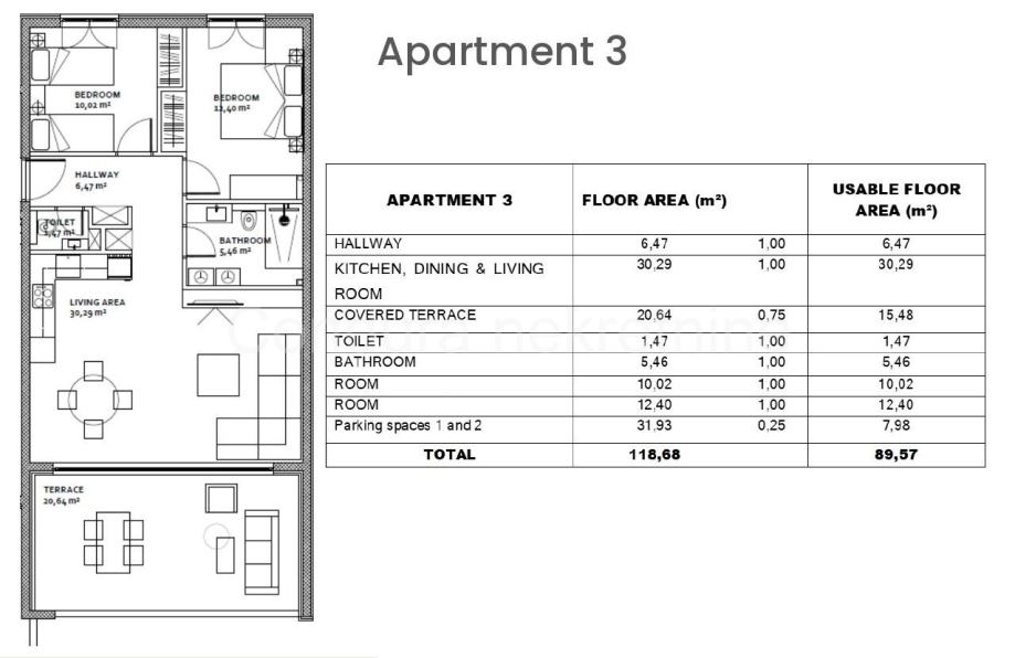 Ukupna neto površina apartmana s pripadcima iznosi 89,57 m2 te se sastoji od: