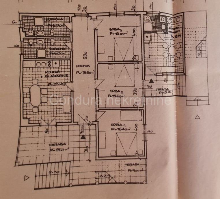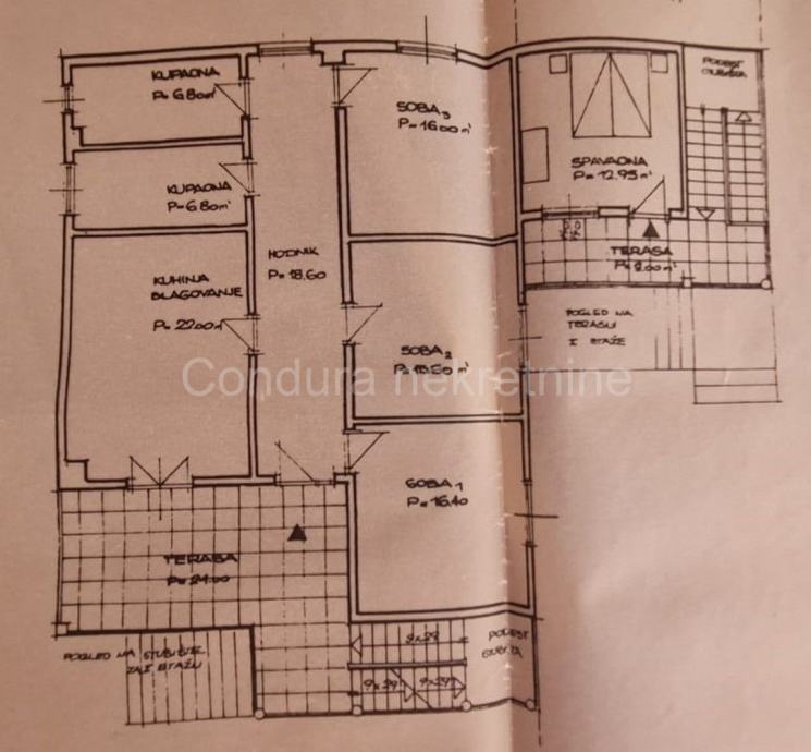 Na prvom katu je također prostran apartman s tri spavaće sobe, dvije kupaonice, kuhinjom i dnevnim boravkom te velikom natkrivenom terasom.