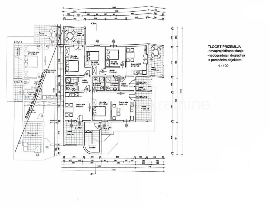 U prizemlju se nalazi jedan studio apartman, dva jednosobna i jedan dvosoban apartman.