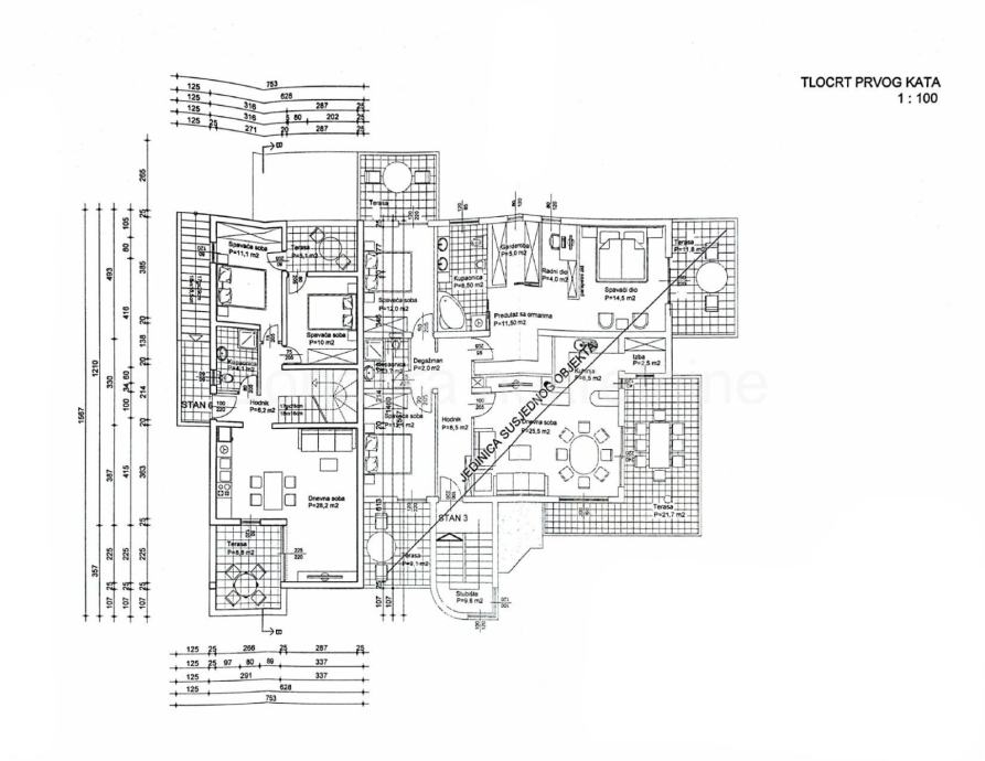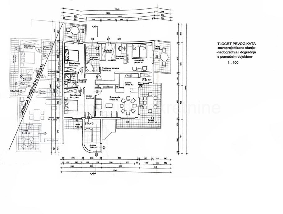 Na prvom katu je prostrani dvosoban stan koji se sastoji od kuhinje s blagovaonicom i dnevnim boravkom, jedne spavaće sobe, kupaonice te glavne spavaće sobe s vlastitom kupaonicom i garderobom. Na prvom katu je i dvoetažni apartman koji se dijelom proteže i u potkrovlju a sastoji se od četiri spavaće sobe, dvije kupaonice, kuhinje s blagovaonicom te dnevnog boravka.