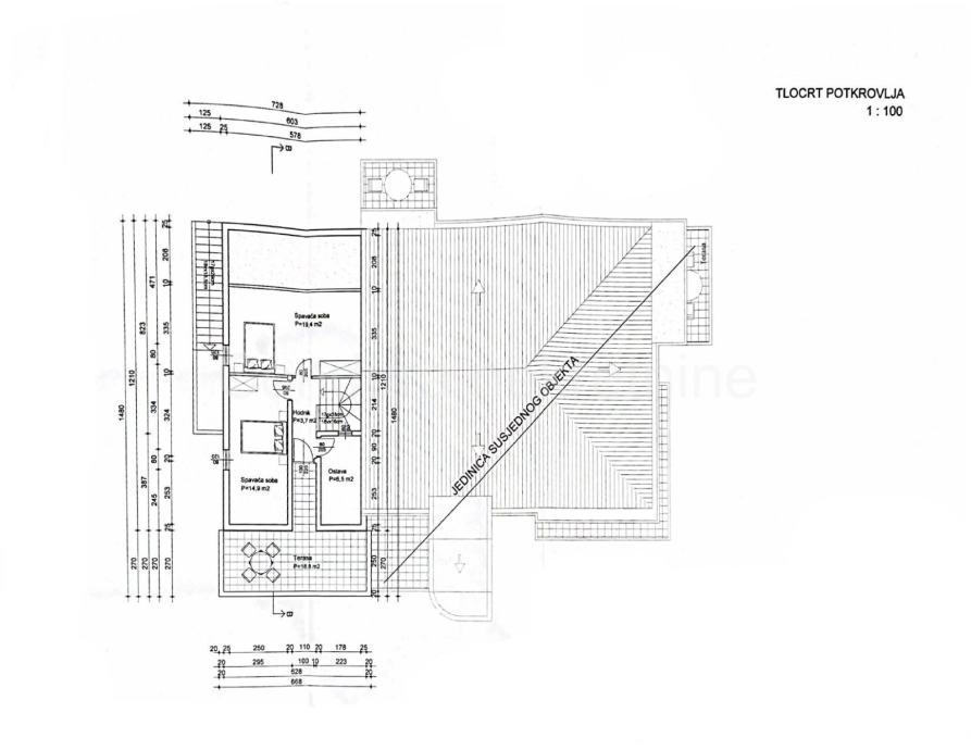 Kuća neto površine 452,5 m2 je sagrađena na zemljištu veličine 2241 m2. Sastoji se od prizemlja, jednog kata i potkrovlja.
