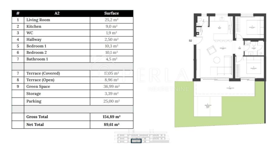 A2 – prizemlje, dvosoban apartman s vrtom, 89,61 m² – 432.000,00 €