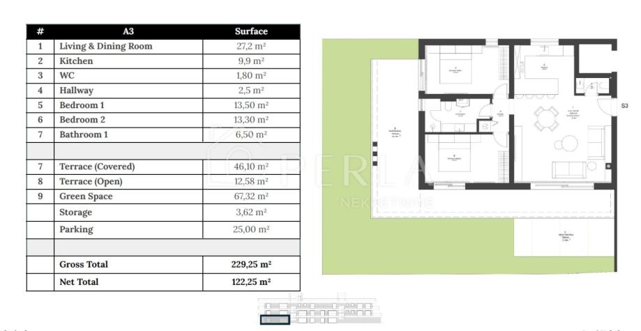 A3 – prizemlje, dvosoban apartman s vrtom, 122,25 m² – 585.600,00 €