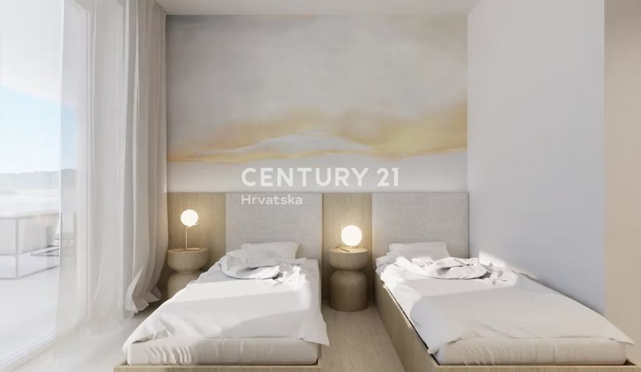 Stan 4 na drugom katu zgrade iskoristive površine 208,50 m2 sastoji se od: ulaznog hodnika, kuhinje, blagovaonice i dnevnog boravka, tri spavaće sobe (master bedroom i 2 manje), 3 kupaonice i 1 WC-a, praonice, spremišta te natkrivene terase. Stanu, također, pripadaju 2 nenatkrivena parkirna mjesta te velika, dijelom natkrivena krovna terasa s koje se pruža prekrasan pogled na more te koja nudi dragocjenu privatnost. Ukupna bruto površina stana iznosi 343,59 m2.