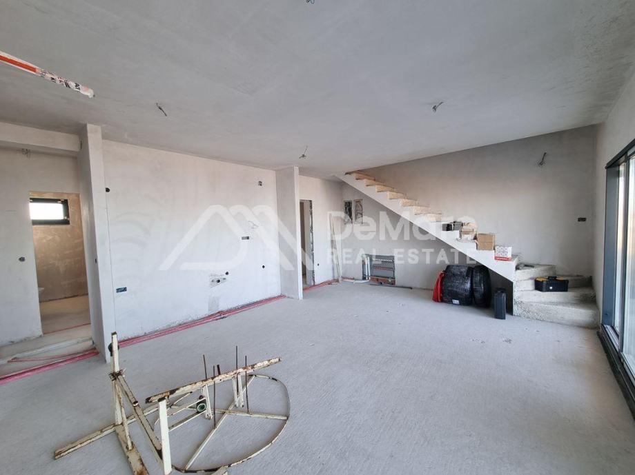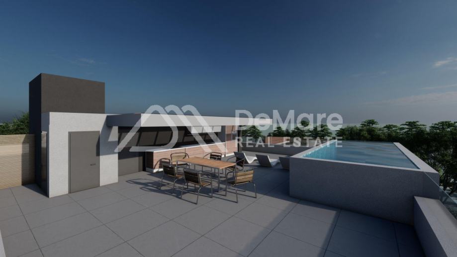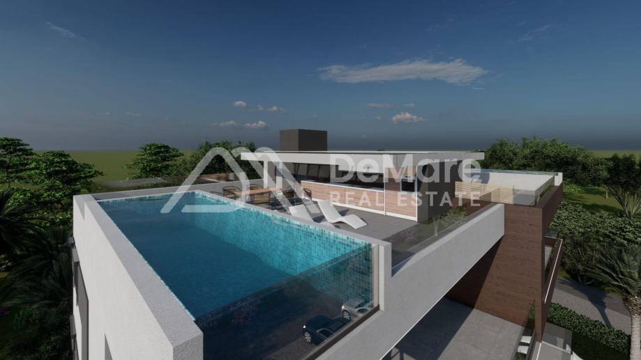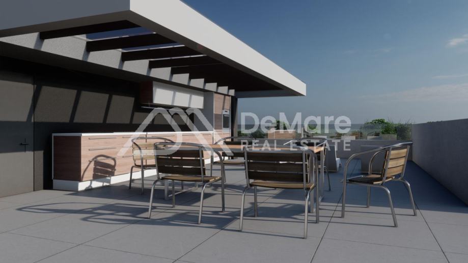 Ovo je stan na drugom katu. Raspored prostorija čine hodnik, 2 spavaće sobe, spavaća soba s kupaonicom, kupaonica, kuhinja s blagovaonicom i dnevnim boravkom te dijelom natkrivena terasa. Iz stana se dolazi direktno na krovnu terasu koja pripada ovom stanu. Površina krovne terase iznosi 102,32 m2. Na terasi je bazen od 15,30 m2.