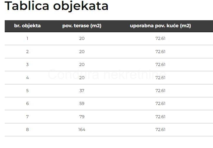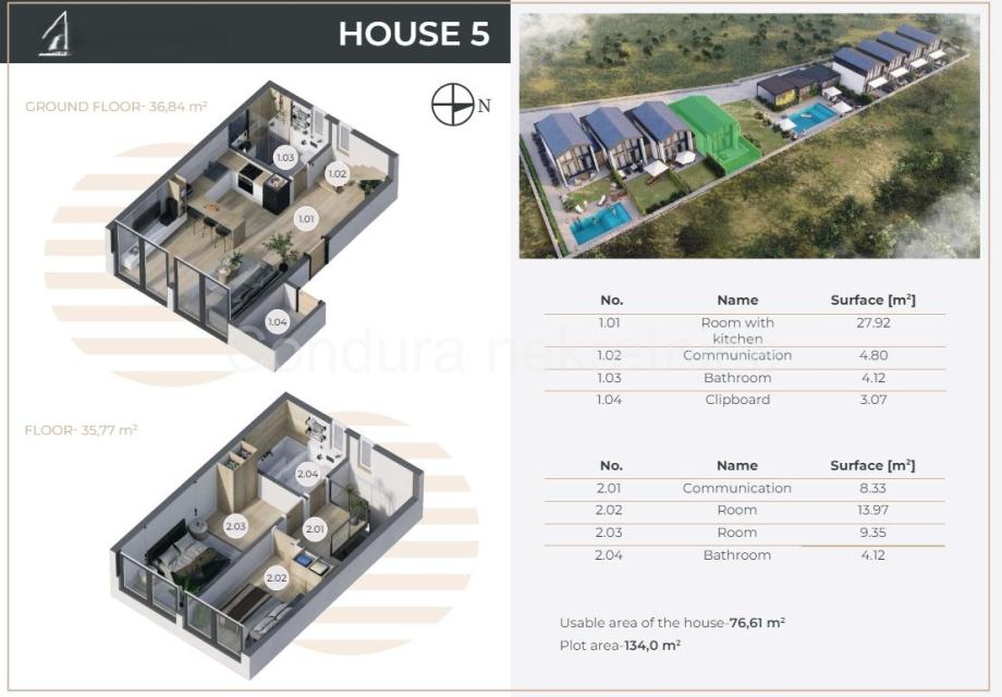Kuća br. 5, ukupne kvadrature 76, 61 m2 i parcele 134 m2 sastoji se od dvije spavaće sobe, dvije kupaonice, ostave, kuhinje s dnevnm boravkom i blagavaonicom.