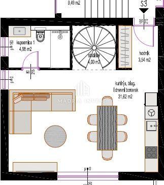 Dvoetažni apartman s krovnom terasom. Apartman se proteže kroz 1. kat, 2. kat i na krovnu terasu.