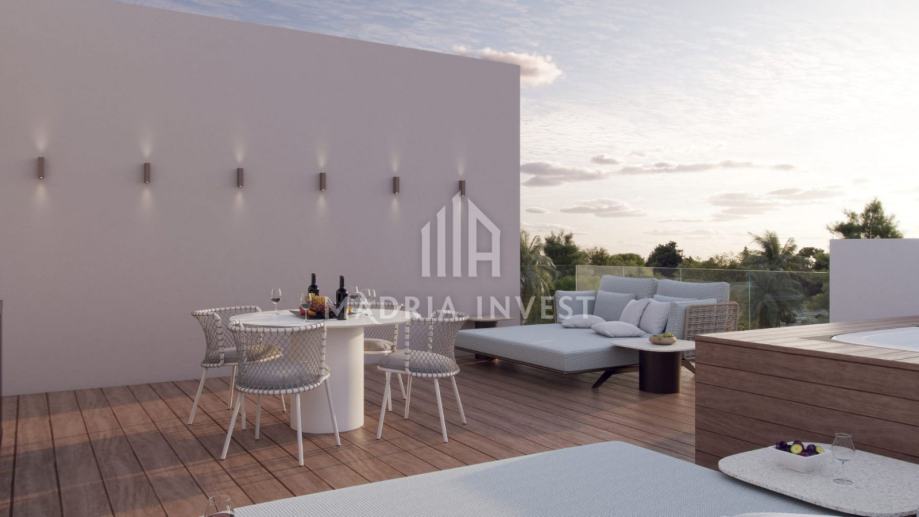 Dvoetažni stan s krovnom terasom. Stan se proteže kroz 1. kat, 2. kat i na krovnu terasu.