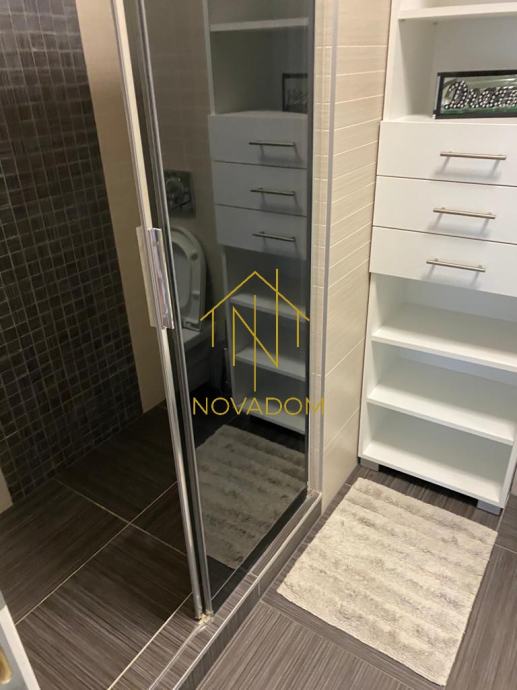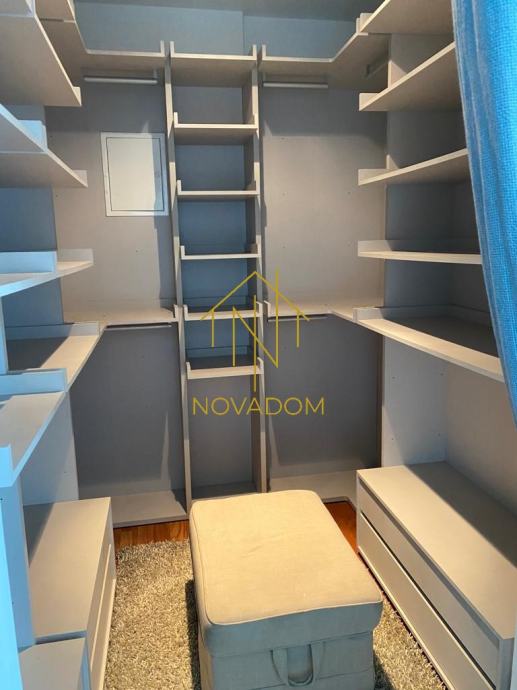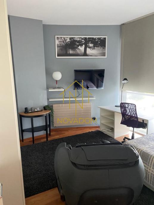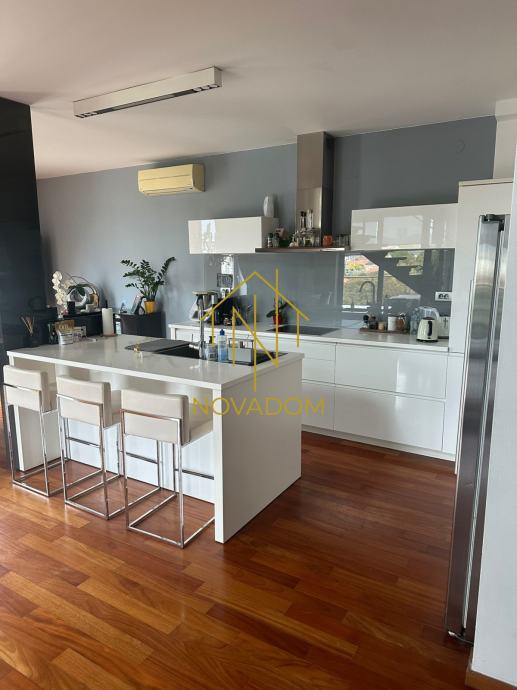 Stan se sastoji od 2 etaže: 1. etaža se sastoji od ulaznog hodnika, dnevnog boravka, kuhinje s blagovaonom, zasebne sobe, zasebnog toaleta i prostrane loggie s prekrasnim pogledom na grad. Gornja etaža stana sastoji se od hodnika, master spavaće sobe s garderobom i kupaonom s wc-om, dvije dječje spavaće sobe i kupaone s wc-om. Pripada mu garažno parkirno mjesto od 9 m2 .