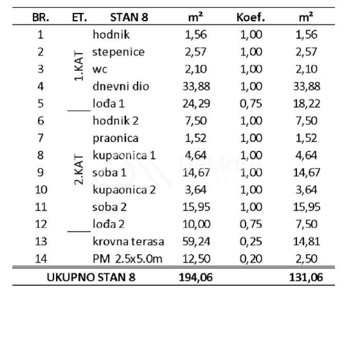 ≅ Ukupna površina stana iznosi 194 m2, dok korisna obračunska vrijednost površine ovog apartmana iznosi 131 m2.