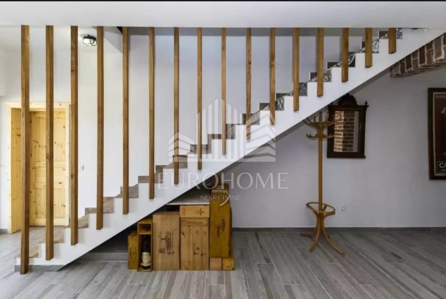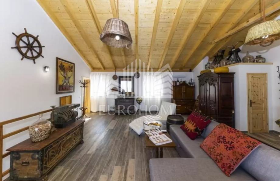 Sastoji se od prizemlja i kata. U prizemlju je opremljena kuhinja s kaminom, prostrana blagovaona, prostrani dnevni boravak od 47m2, WC i tri spavaće sobe s vlastitim kupaonicama. Dnevni boravak ima izlaz na uređenu terasu od 30m2 s pogledom na more. Na kat vode unutarnje stepenice na kojem su se smjestile dvije spavaće sobe s kupaonicama, dodatni wc za goste, veliki dnevni boravak koji je sa staklenom stijenom odijeljen od prostrane terase od 33 m² s otvorenim pogledom na more i teretana. Na katu se nalazi još i mala prostorija u kojoj je bojler od 400l sa solarnim sustavom.