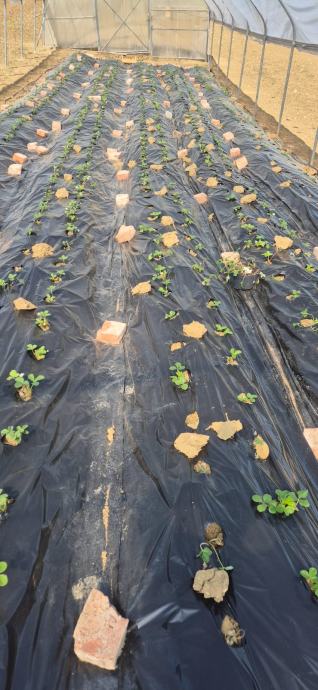 Plastenik površine 200 m² sa sustavom navodnjavanja kap po kap (vrijednost 8.000 €, potrebno zamijeniti nailon na plasteniku), posađeno 1000 kom jagoda
