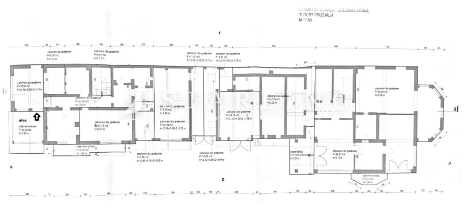 Na prostranoj parceli se nalazi stambena zgrada površine 454 m2 a sastoji se od 22 soba, 2 kuhinje, 5 kupaonica, 3 zasebna wc-a, 4 terase, 1 balkona i 7 hodnika.