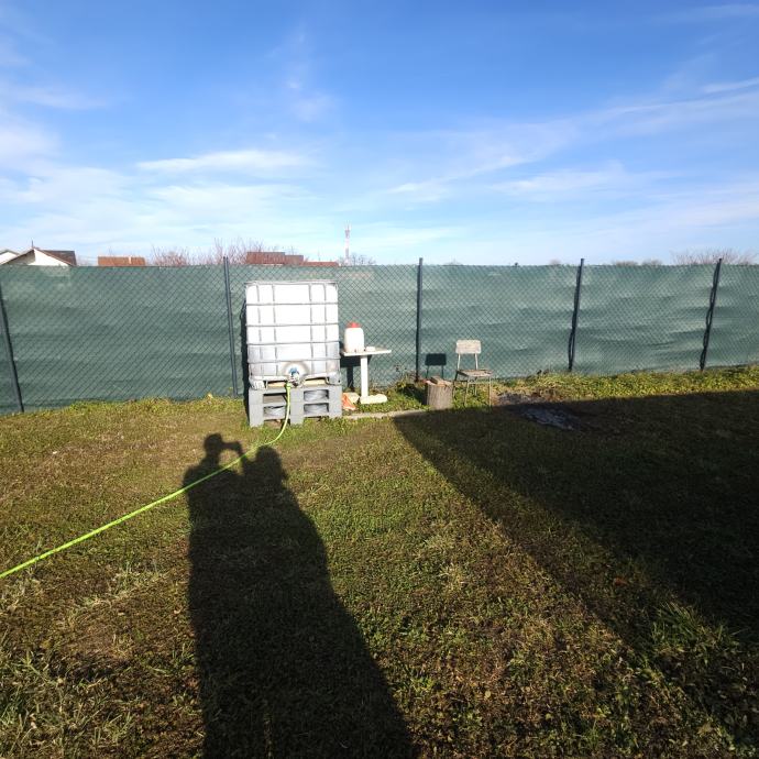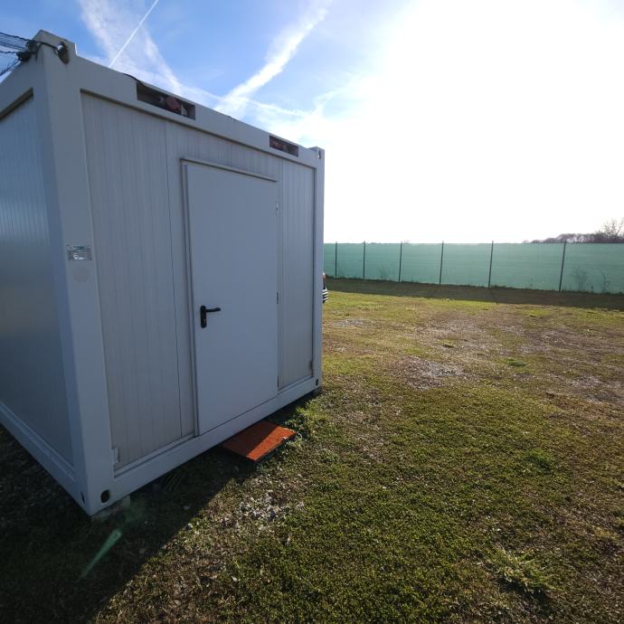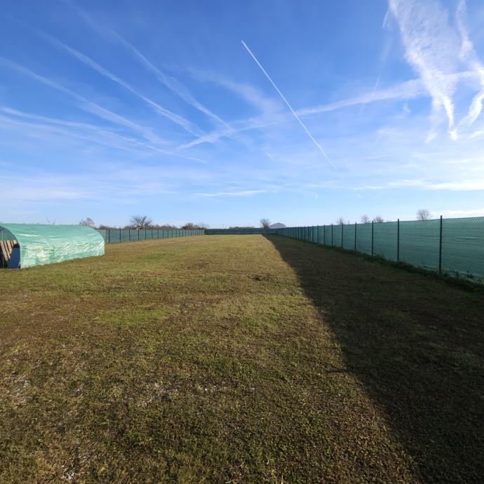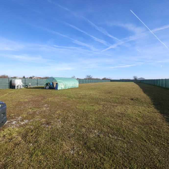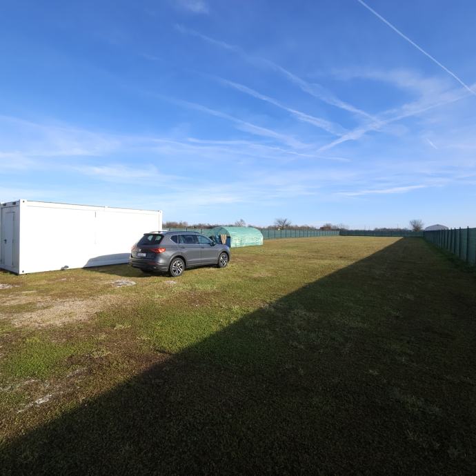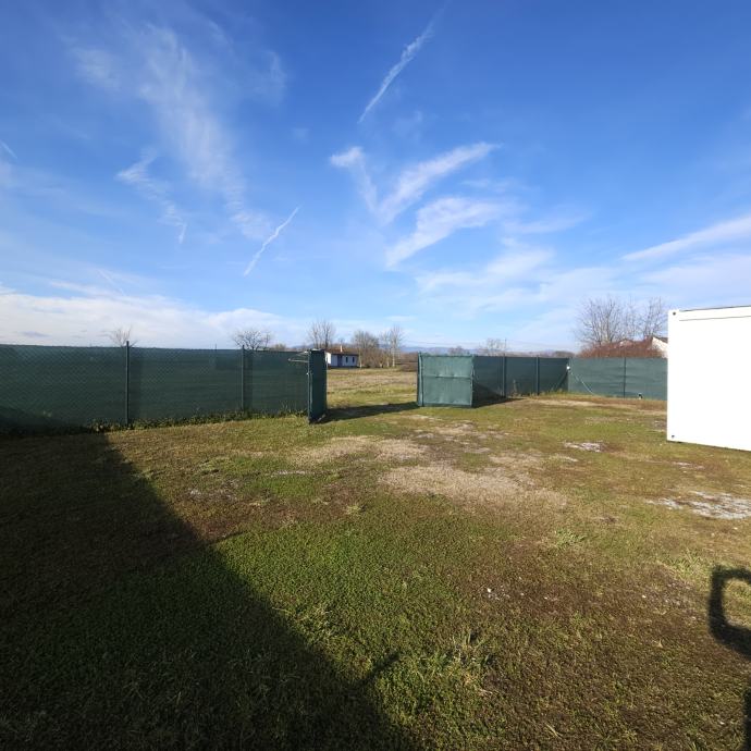 Teren je ravan, kompletno ograđen, pravkoutnog oblika s montažnim objektom i spremištem.