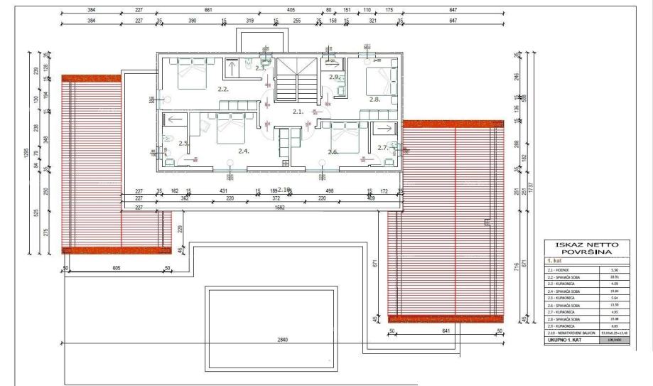 U ponudi je građevinska parcela s projektom i građevinskom dozvolom za kuću katnicu s bazenom.
