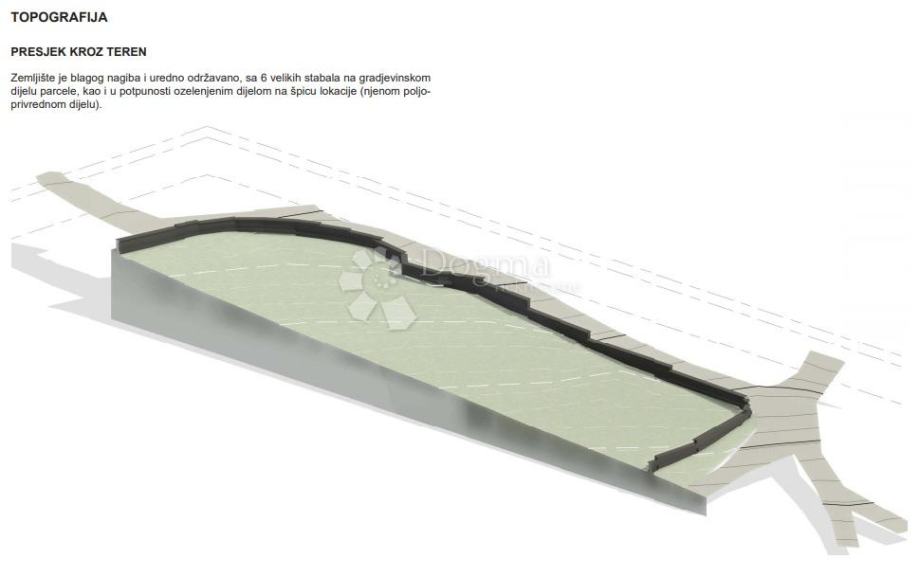 Blagi nagib i uredno održavan teren. Na građevinskom dijelu nalazi se šest velikih stabala, dok je poljoprivredni dio parcele u potpunosti ozelenjen.