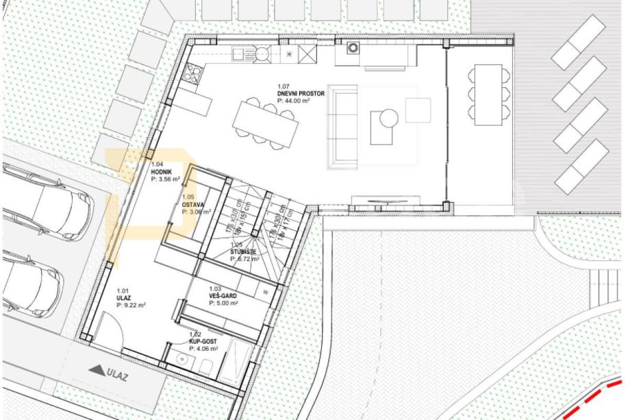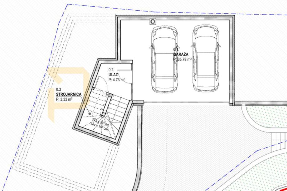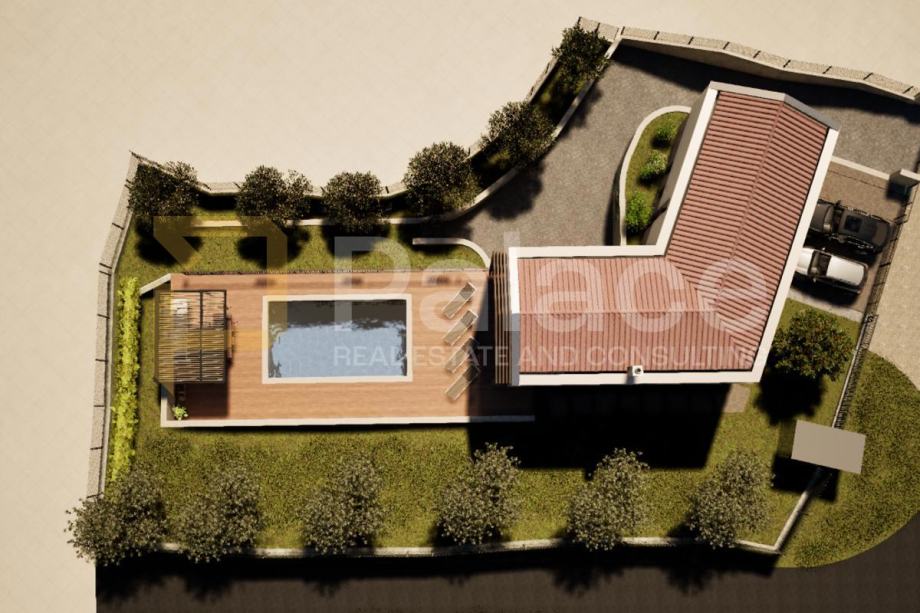 Posebna prednost ove nekretnine je činjenica da je građevinska dozvola već izdana, a projekt predviđa modernu obiteljsku kuću s bazenom. Kuća se sastoji od tri spavaće sobe, dvije kupaonice, otvorenog koncepta kuhinje, blagovaonice i dnevnog boravka te prostrane garaže za dva automobila. Svi komunalni doprinosi su plaćeni u cijelosti, što dodatno pojednostavljuje proces. Riječ je o odličnoj prilici za sve koji traže zemljište s urednom dokumentacijom i spremnošću za gradnju u mirnom okruženju nedaleko od povijesno značajnog Huma.