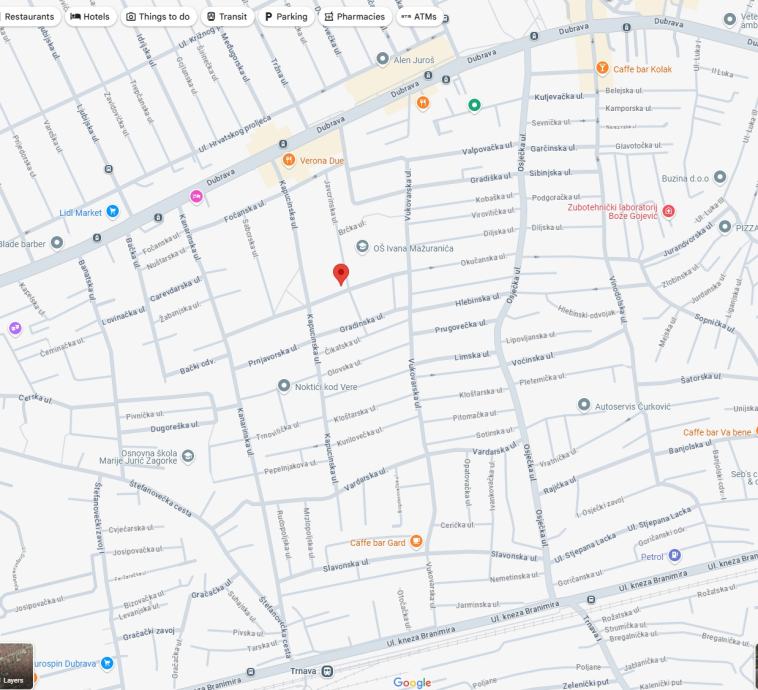 Lokacija je odlicna, 2 min od Avenije Dubrava (tramvaja), nalazi se u ulici gdje je osnovna skola, blizina velikog parka, vrtića, placa, kazališta Dubrava, dezurne ljekarne, stanice vlaka...