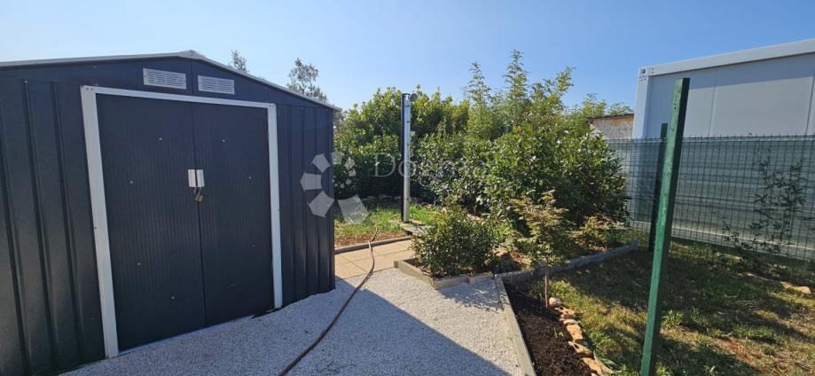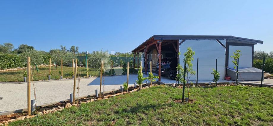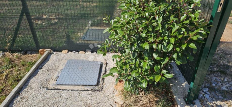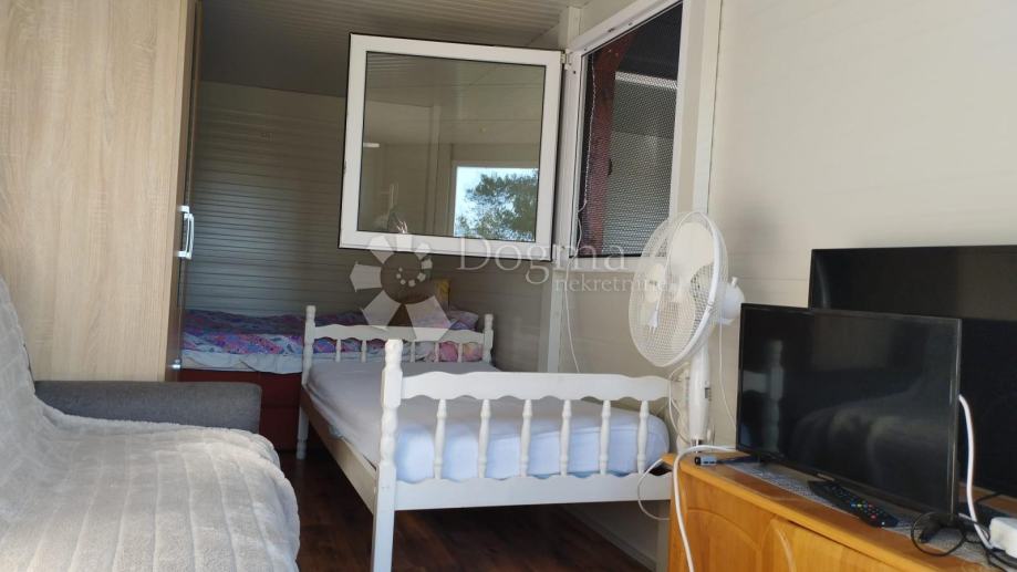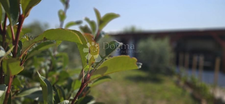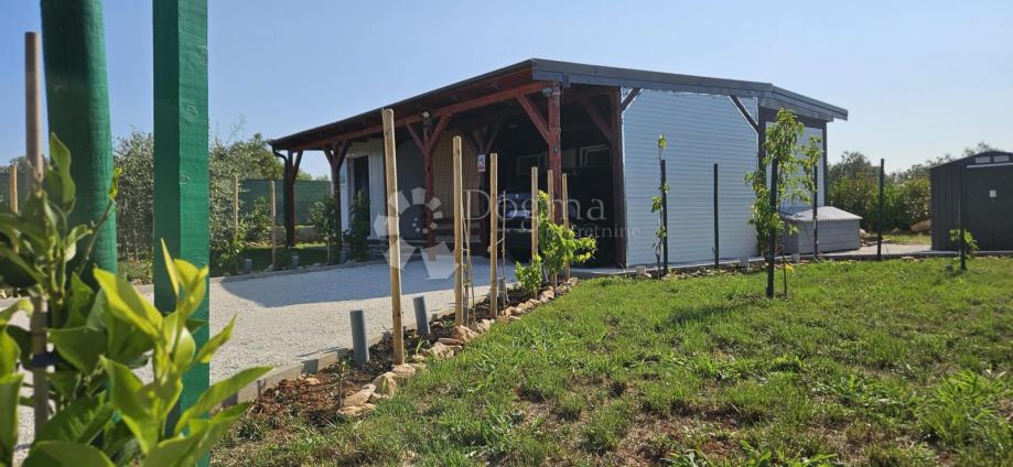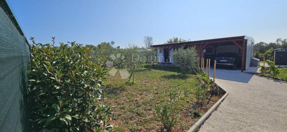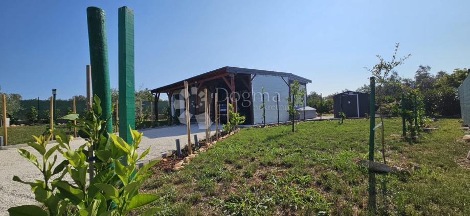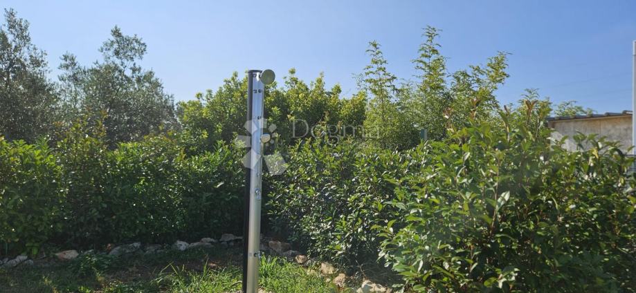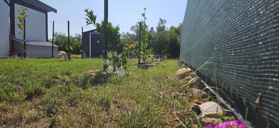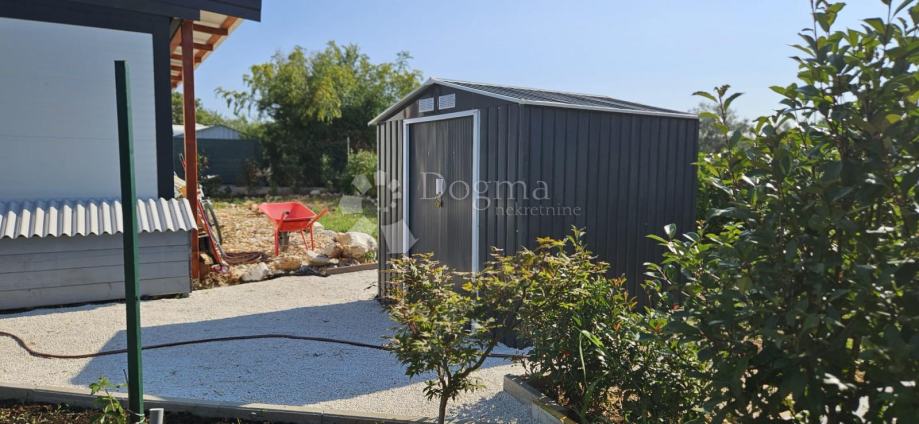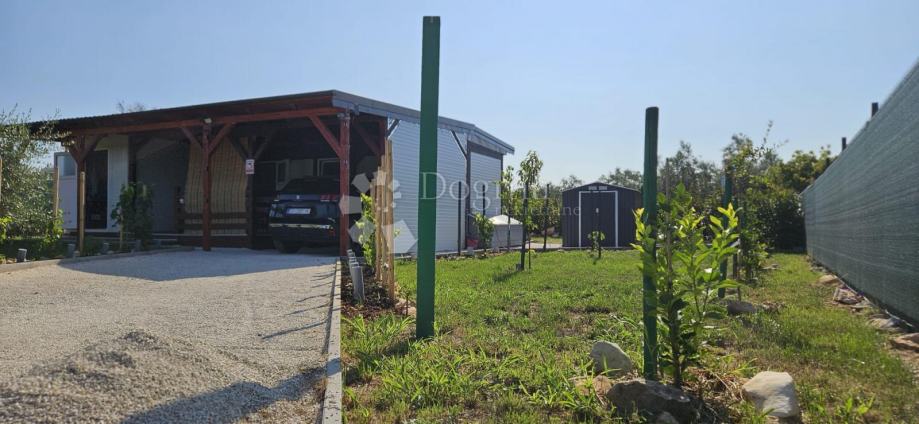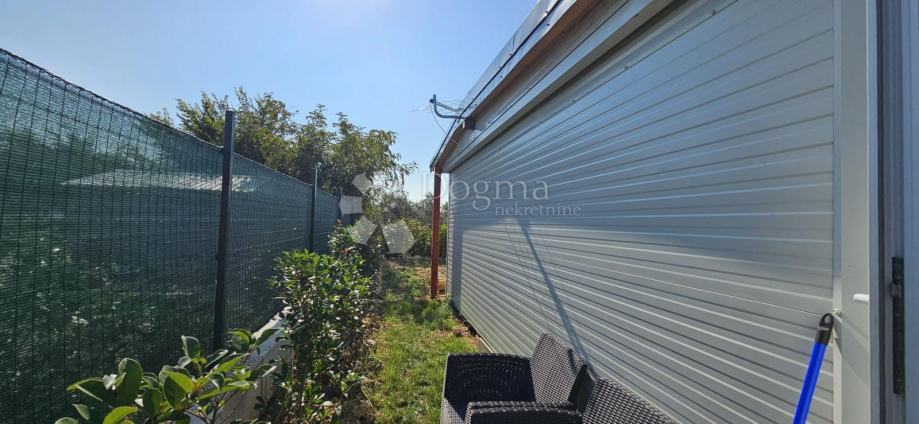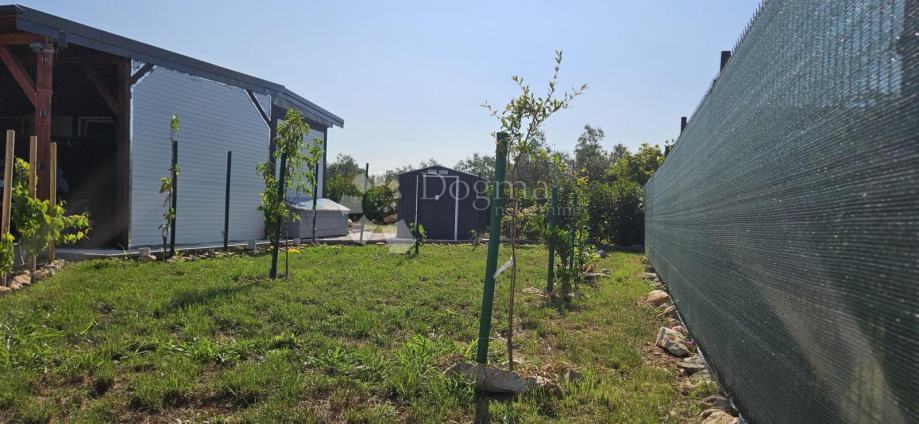 Poljoprivredno zemljište veličine 472 m2 sa nelegaliziranim vrlo modernim objektom. Objekt je se sastoji od dva povezana kontejnera stambenog prostora (kontejner 1 kvadrature 6 x 2.3 m2: spavaća soba; kontejner 2 kvadrature 7 x 2.3 m2: kuhinja, dnevni boravak i kupaonica), vrlo ugodne natkrivene terase (površine 3.7 x 3.7 m2) i svojevrsne garaže koja se može koristiti u razne svrhe te vanjski tuš. Na zemljištu se nalazi voda s jednim zajedničkim priključkom i bušotina (na 32 m dubine), a struja jačine 1.5 kW je preko solarnog sustava. Na zemljištu je također i nasad od 6 dvogodišnjih maslina i 5 mandarina. Parcela je vrlo lijepo ograđena i ima posađenu živicu.