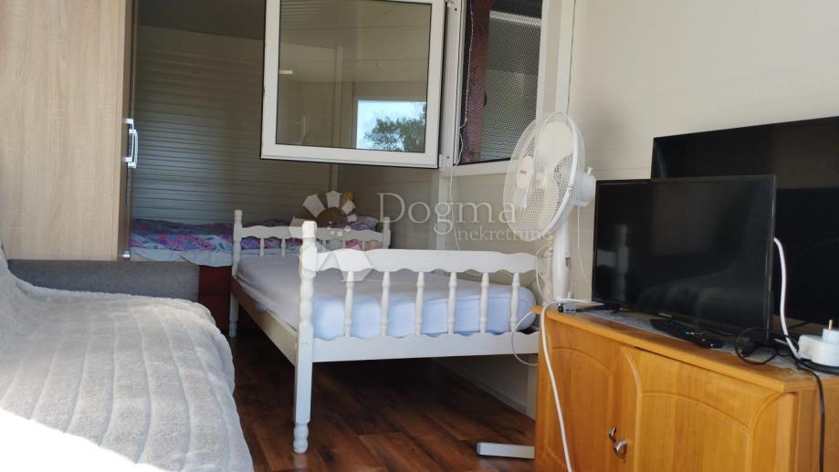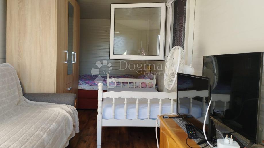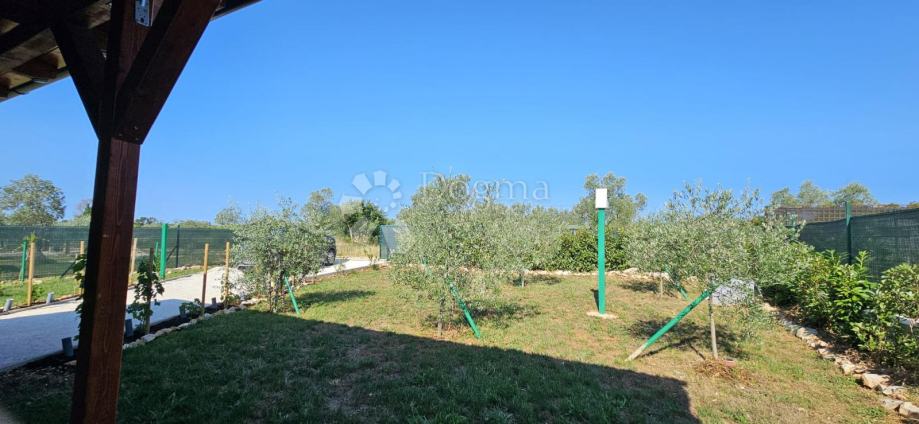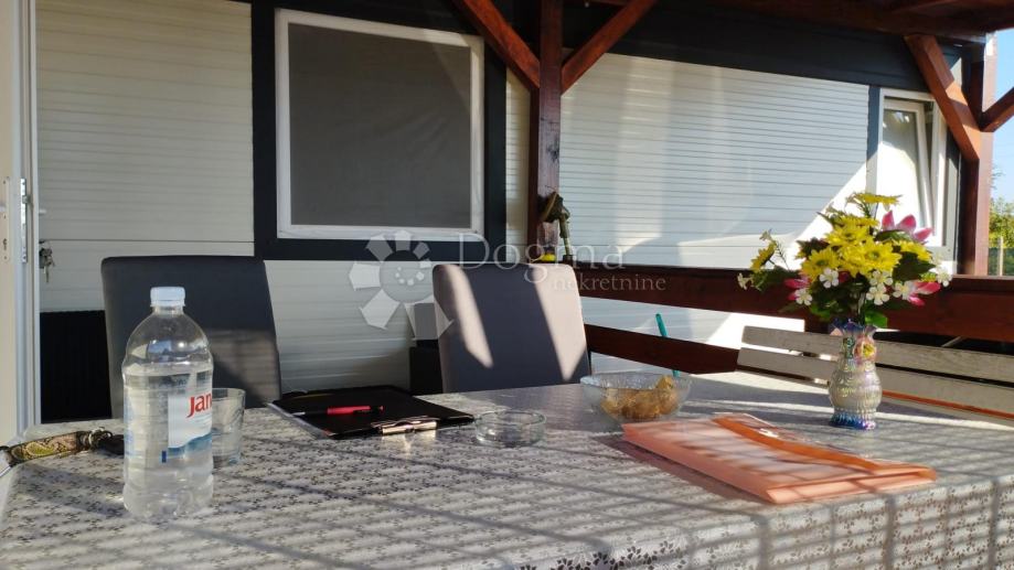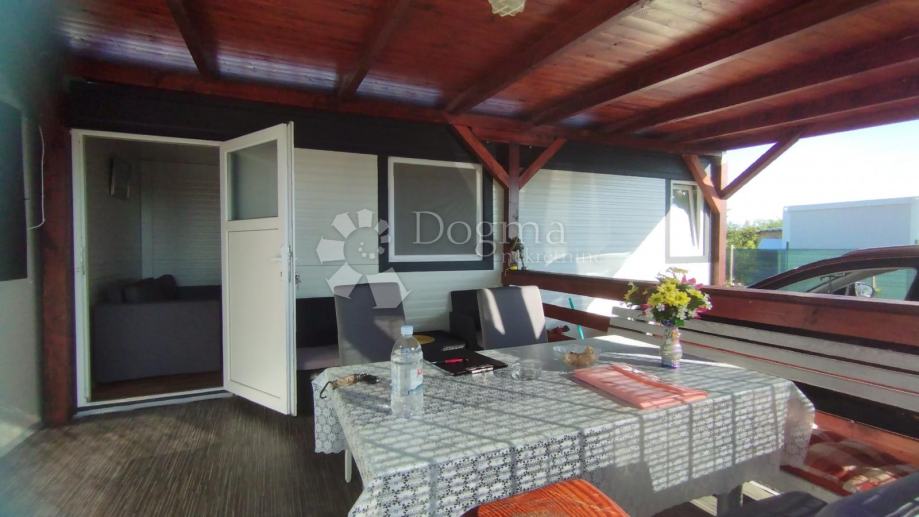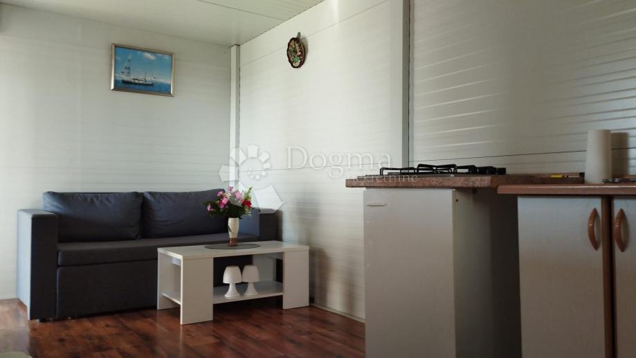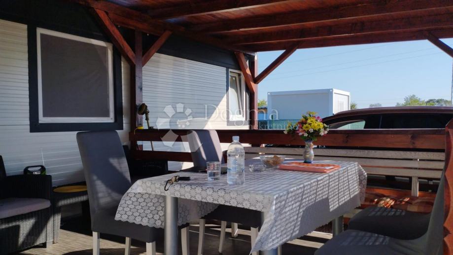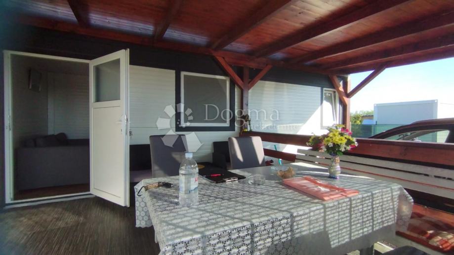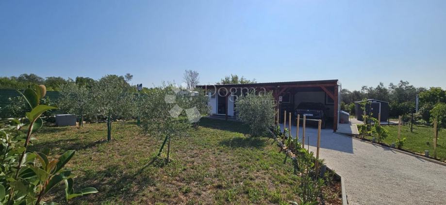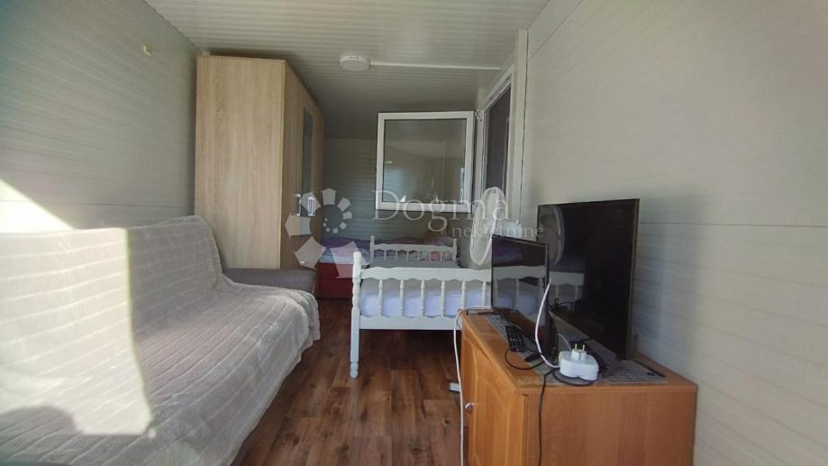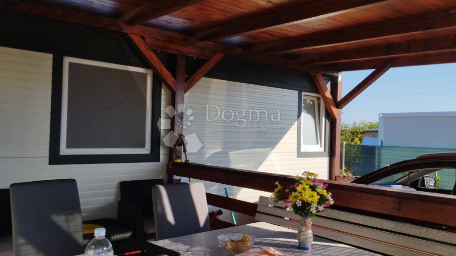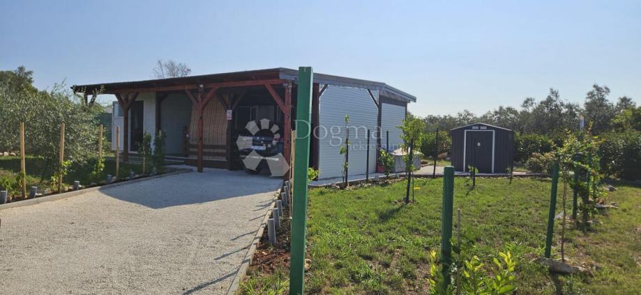 Poljoprivredno zemljište veličine 472 m2 sa nelegaliziranim vrlo modernim objektom. Objekt je se sastoji od dva povezana kontejnera stambenog prostora (kontejner 1 kvadrature 6 x 2.3 m2: spavaća soba; kontejner 2 kvadrature 7 x 2.3 m2: kuhinja, dnevni boravak i kupaonica), vrlo ugodne natkrivene terase (površine 3.7 x 3.7 m2) i svojevrsne garaže koja se može koristiti u razne svrhe te vanjski tuš. Na zemljištu se nalazi voda s jednim zajedničkim priključkom i bušotina (na 32 m dubine), a struja jačine 1.5 kW je preko solarnog sustava. Na zemljištu je također i nasad od 6 dvogodišnjih maslina i 5 mandarina. Parcela je vrlo lijepo ograđena i ima posađenu živicu.