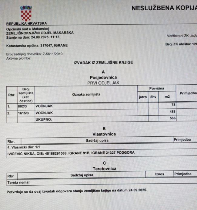 Prodaje se poljoprivredno zemljište na lokaciji Igrane, nadomak Makarske, zemljište od 488m kvadratnih.