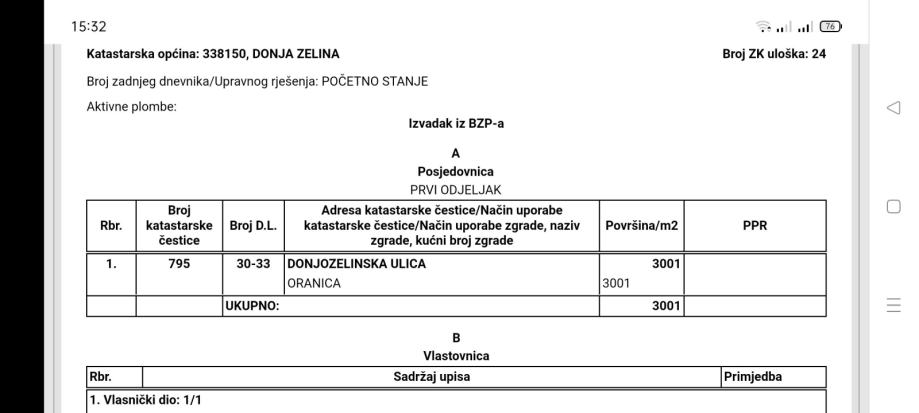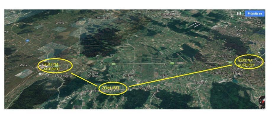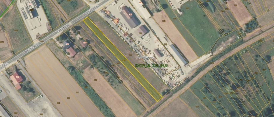 Zemljište površine 3001 m² u Donjoj Zelini, uz glavnu prometnicu, širine cca 12 m i dužine cca 250 m.