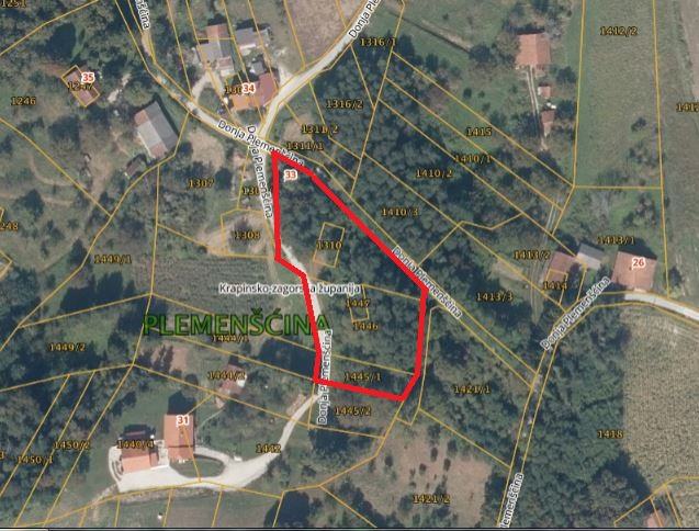 Građevinsko zemljište nalazi se u Donjoj Plemenšćini 2,5 km sjeverno od Pregrade na brežuljkastom terenu na vinskoj cesti Pregrada - Đurmanec oko 10 km udaljenosti od granice sa Slovenijom.Na parceli se nalazi temelji stare kuće i štaglja ucrtani u katastarski plan.