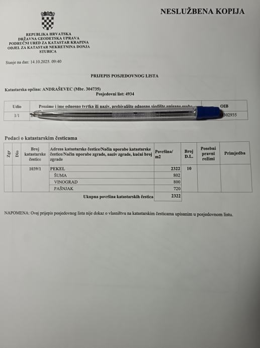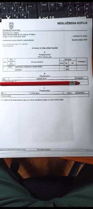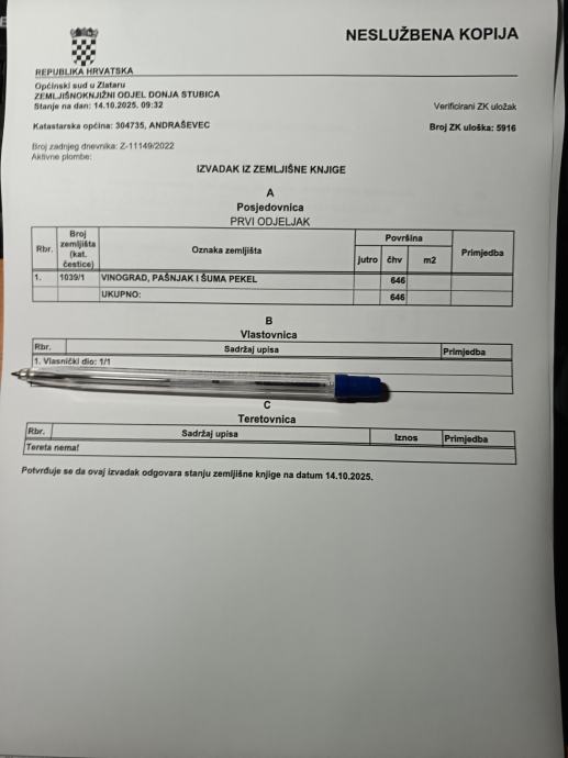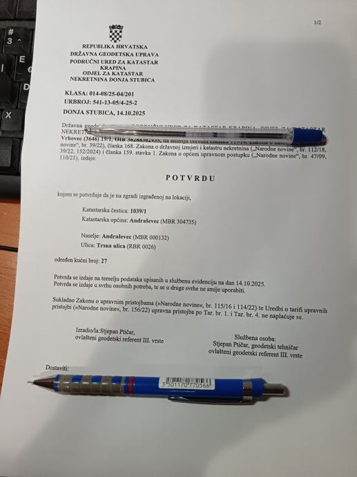 Adresa je Trsna ulica 27 Andraševec. Vlasništvo 1/2 čisto gruntovno i katastarskim bez tereta.