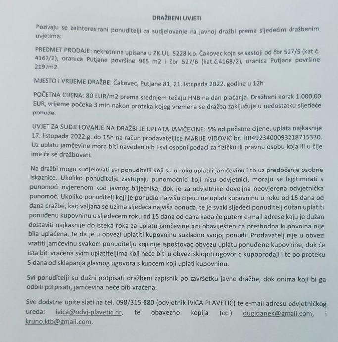 MJESTO I VRIJEME DRAŽBE: Čakovec, Putjane 81, 21.listopada 2022. godine u 12 sati.