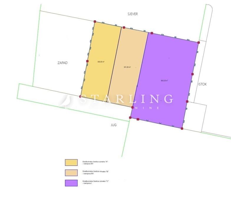 Prodaje se zemljište pravilnog oblika površine 1264 m2. Dio zemljišta nalazi se u zoni mješovite namjene (M), a veći dio je gospodarske namjene (G).