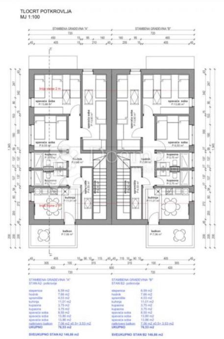 S površinom od 1264 m2 i projektom za dvije poluugrađene građevine sa ukupno 4 stana, donosi potencijal za razvoj. . Dostupni su svi potrebni priključci.