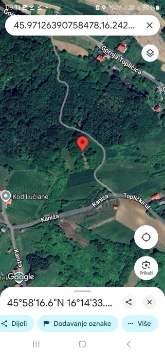 Ukupno 3903m2 na 3 lokacije, dvije čestice su spojene ukupne površine 2719m2 oranica, trenutno šuma i dva vinograda 785m2 i 399m2.