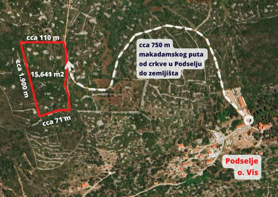 U blizini slikovitog mjesta Podselje na otoku Visu nalazi se sunčano poljoprivredno zemljište površine 15.641 m². Ovo zemljište, nazvano Mažurana, okruženo je suhozidom na istočnoj i južnoj granici, a prekriveno je bujnom otočkom vegetacijom s nekoliko maslina, što mu daje autentičan mediteranski ugođaj. U daljini se pruža prekrasan pogled na more, što dodatno doprinosi njegovoj privlačnosti.