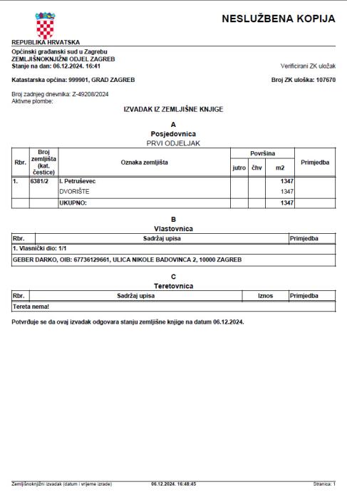 Prodajem ograđenu parcelu katastarske oznake DVORIŠTE, zemljište privedeno namjeni kao npr. parking, otvoreno, montažno ili kontejnersko skladište i sl. Parcela je pravilnog oblika veličine 1347 m2. Položena je uz glavnu asfaltiranu cestu kroz koju prolaze sve potrebne instalacije (struja, voda…), a njome prometuje i ZET (stanica u blizini). Parcela je pogodna za promet kamiona i šlepera.