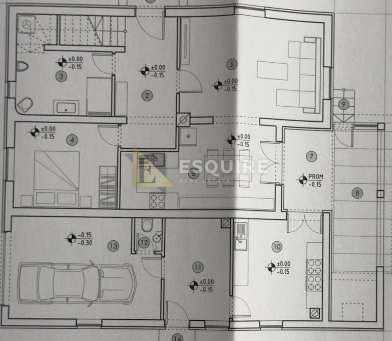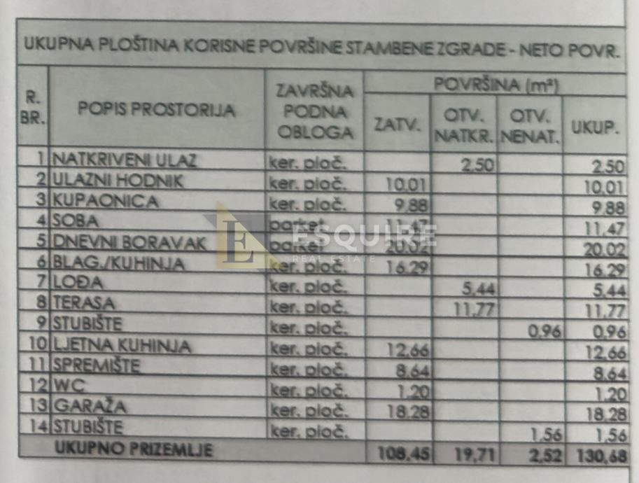 Prizemlje obuhvaća garažu, kotlovnicu, pomoćni WC te praktičnu ljetnu kuhinju koja vodi na terasu s roštiljem – savršeno mjesto za druženja na otvorenom.