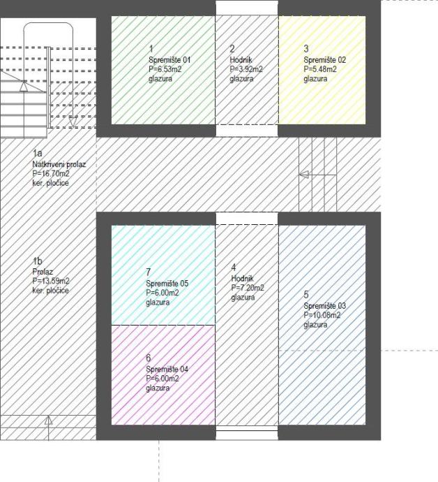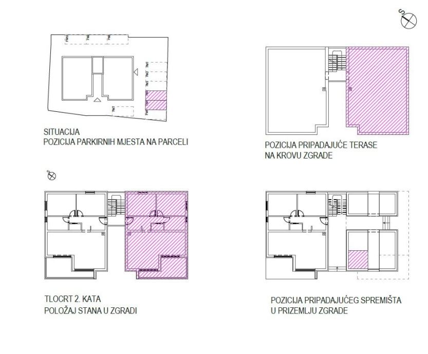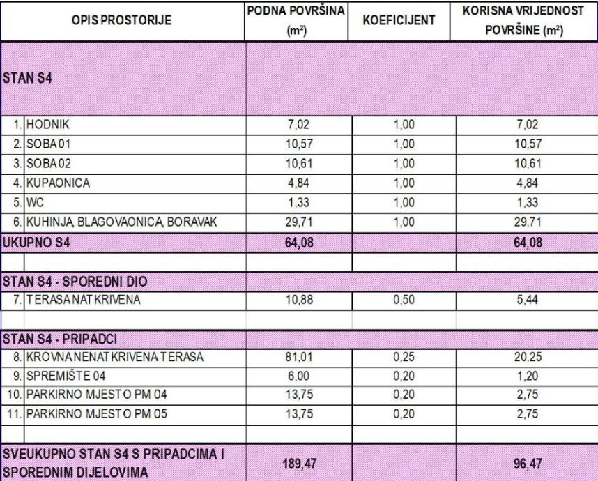 Stan se sastoji od hodnika, prostranog dnevnog boravka s kuhinjom i blagovaonom s direktnim izlazom na terasu, 2 spavaće sobe, kupaonice, wca dodatno te krovna terasa površine 81m2. Stanu pripada spremište oznake 04 površine 6m2 te dva parkirna mjesta oznake PM04 i PM05 svako površine 13.75m2.