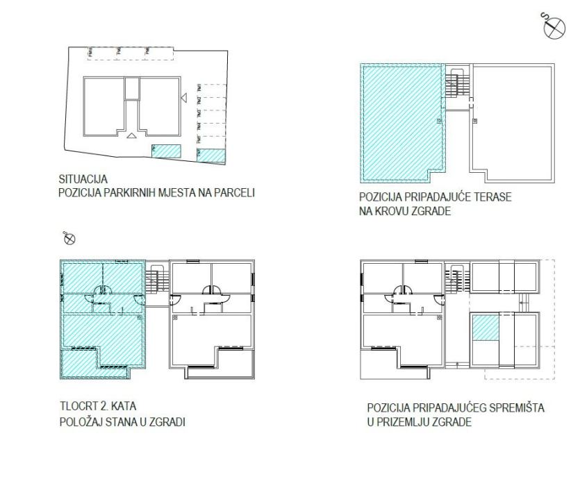 Stan se sastoji od hodnika, prostranog dnevnog boravka s kuhinjom i blagovaonom s direktnim izlazom na terasu s koje se prostire prekrasan pogled na more, 2 spavaće sobe, kupaonice, wca dodatno te krovna terasa s pogledom na more površine 81m2. Stanu pripada spremište oznake 05 površine 6m2 te dva parkirna mjesta oznake PM06 i PM07 svako površine 13.75m2.