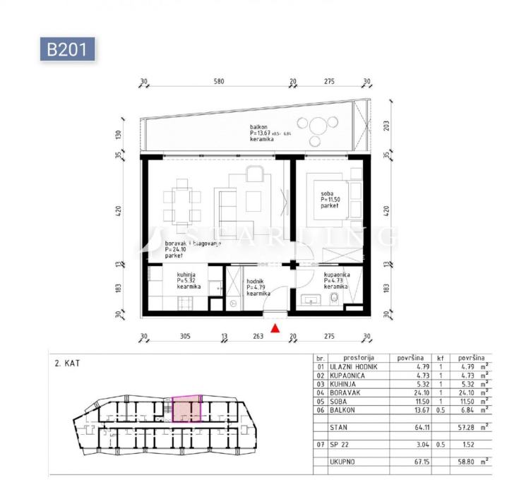 Prodaje se dvosoban stan površine 58,80 m2 na 2. katu ZGRADE B s liftom.