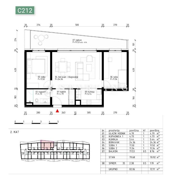 Prodaje se trosoban stan površine 72,11 m2 na 2. katu ZGRADE C s liftom.