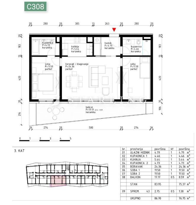 Prodaje se trosoban stan površine 76,75 m2 na 3. katu ZGRADE C s liftom.