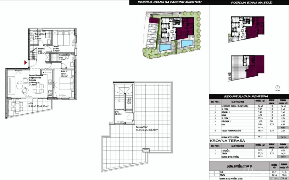 Stan C-S06 - 2. kat - stambena površina 62,80 m2 (2 spavaće sobe + 2 kupaonice) + lođa (12 m2) + krovna terasa (73 m2) + vanjsko parkirno mjesto, sve neto obračunske površine 104,04 m2 = 559.000 EUR