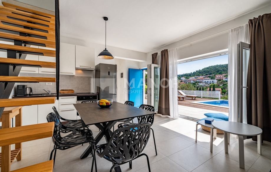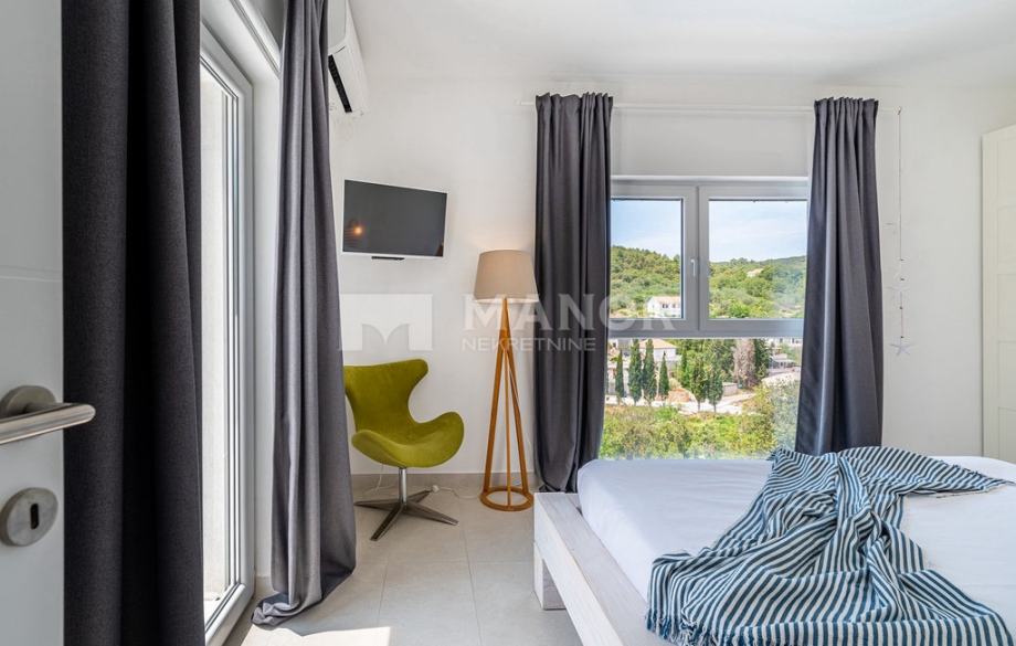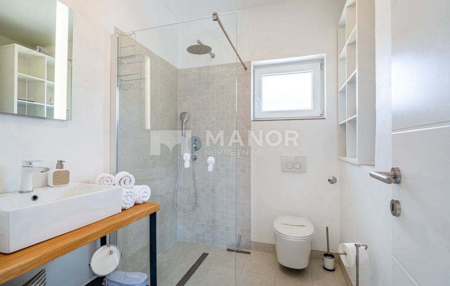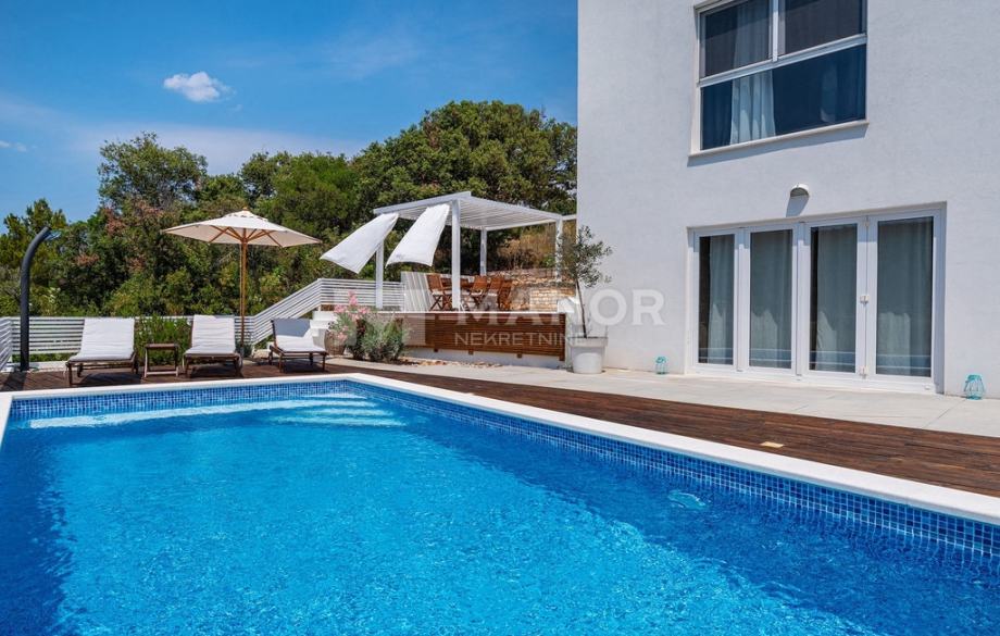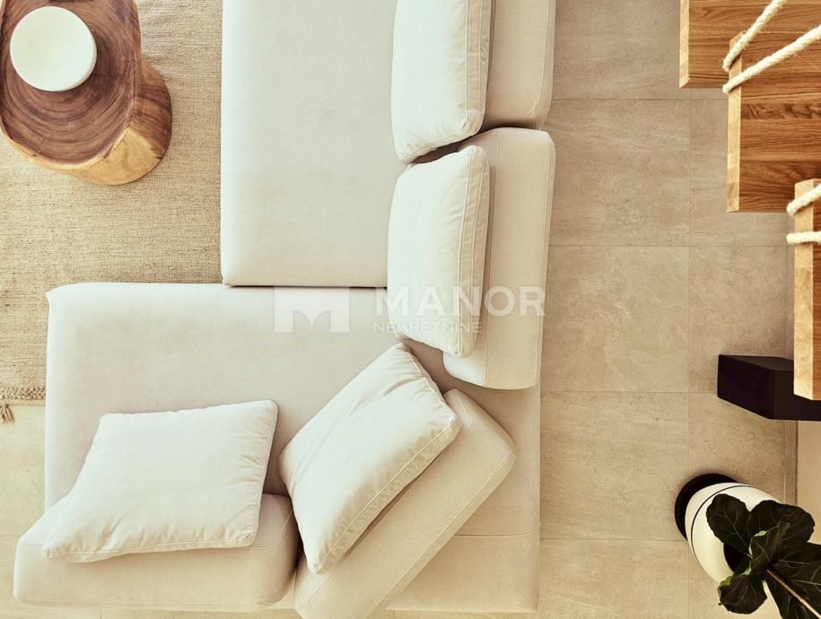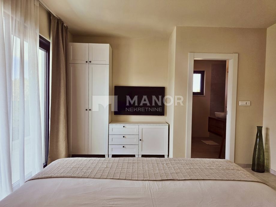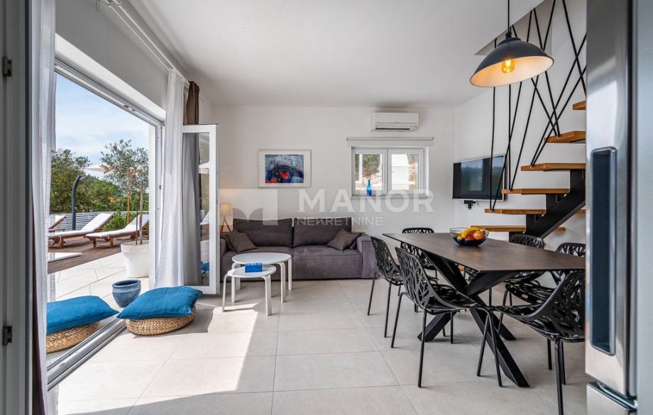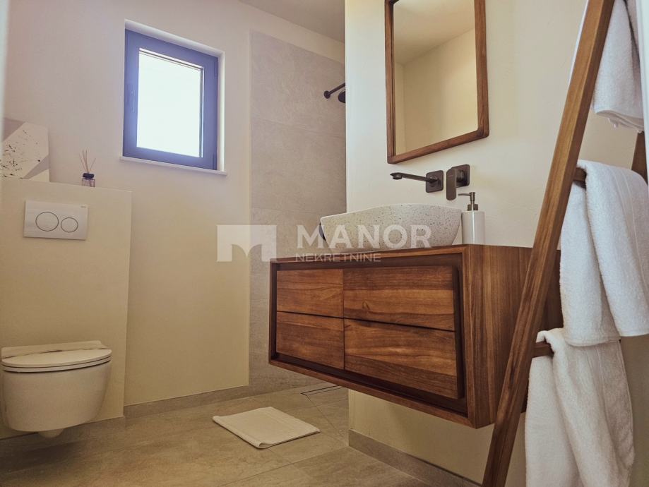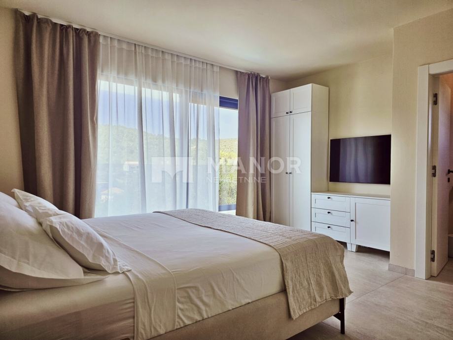 Druga vila smještena je na parceli od 343 m², a njezina ukupna površina iznosi 172 m². Objekt je podijeljen na dva potpuno odvojena dijela, svaki sa zasebnim ulazom, što jamči potpunu privatnost. U glavnom dijelu prizemlje donosi modernu spavaću sobu s kupaonicom, prostrani dnevni boravak, potpuno opremljenu kuhinju te natkrivenu terasu. Unutarnje stepenice vode na kat gdje se nalaze još dvije spavaće sobe i dvije kupaonice. Glavna soba ima vlastiti balkon s predivnim pogledom, dok druga soba također nudi vlastitu kupaonicu i balkon. Drugi, zasebni dio objekta nalazi se s druge strane kuće i nudi dnevni boravak s kuhinjom te spavaću sobu s kupaonicom na katu, ukupne površine 38 m² — idealno za goste ili dodatnu privatnost. Sve prostorije, uključujući dnevne boravke, opremljene su Smart TV-ima. Namještaj je izrađen od masivne hrastovine u interijeru i tikovine u eksterijeru. Kuhinje su izrađene po mjeri i opremljene Bosch uređajima, dok posuđe i kupaonski elementi renomiranih brendova WMF i Villeroy & Boch potvrđuju visoku razinu kvalitete i luksuza.