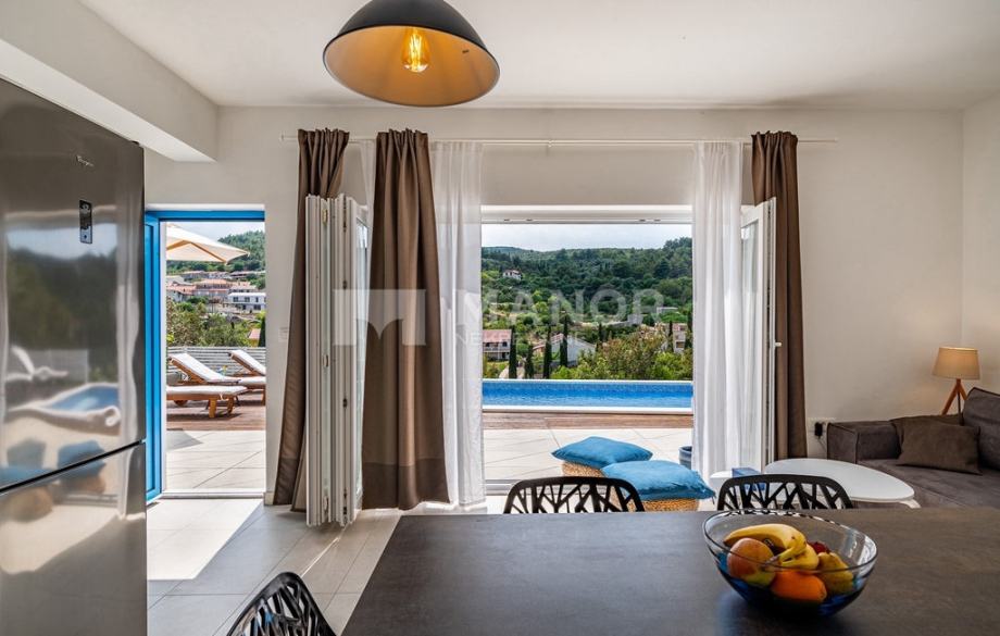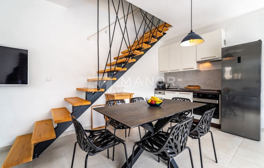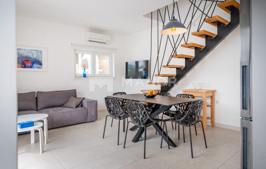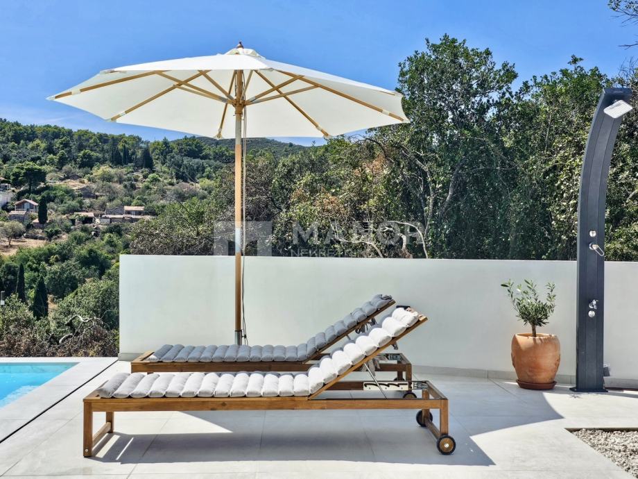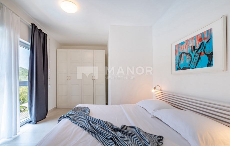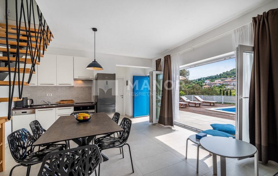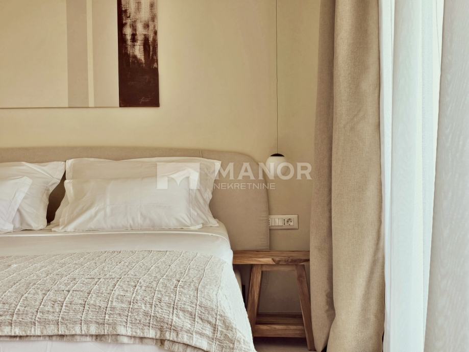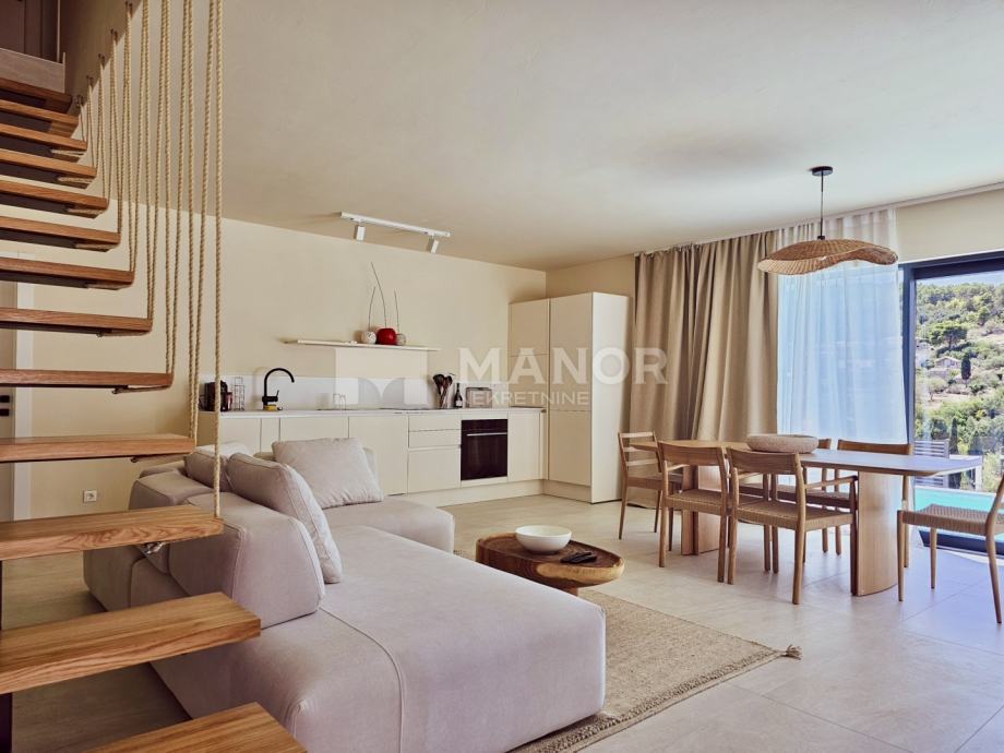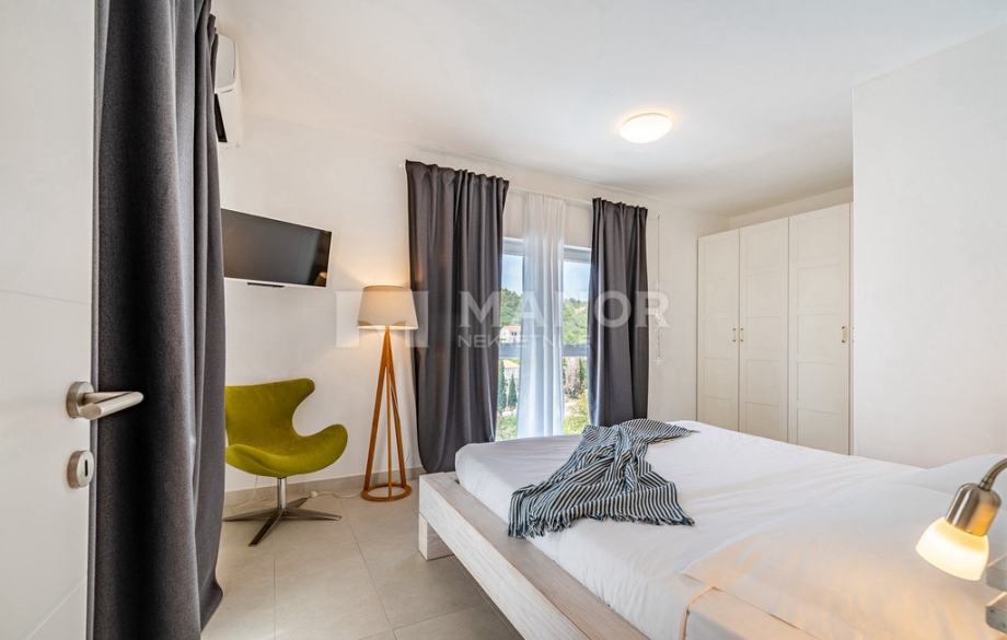 Druga vila smještena je na parceli od 343 m², a njezina ukupna površina iznosi 172 m². Objekt je podijeljen na dva potpuno odvojena dijela, svaki sa zasebnim ulazom, što jamči potpunu privatnost. U glavnom dijelu prizemlje donosi modernu spavaću sobu s kupaonicom, prostrani dnevni boravak, potpuno opremljenu kuhinju te natkrivenu terasu. Unutarnje stepenice vode na kat gdje se nalaze još dvije spavaće sobe i dvije kupaonice. Glavna soba ima vlastiti balkon s predivnim pogledom, dok druga soba također nudi vlastitu kupaonicu i balkon. Drugi, zasebni dio objekta nalazi se s druge strane kuće i nudi dnevni boravak s kuhinjom te spavaću sobu s kupaonicom na katu, ukupne površine 38 m² — idealno za goste ili dodatnu privatnost. Sve prostorije, uključujući dnevne boravke, opremljene su Smart TV-ima. Namještaj je izrađen od masivne hrastovine u interijeru i tikovine u eksterijeru. Kuhinje su izrađene po mjeri i opremljene Bosch uređajima, dok posuđe i kupaonski elementi renomiranih brendova WMF i Villeroy & Boch potvrđuju visoku razinu kvalitete i luksuza.