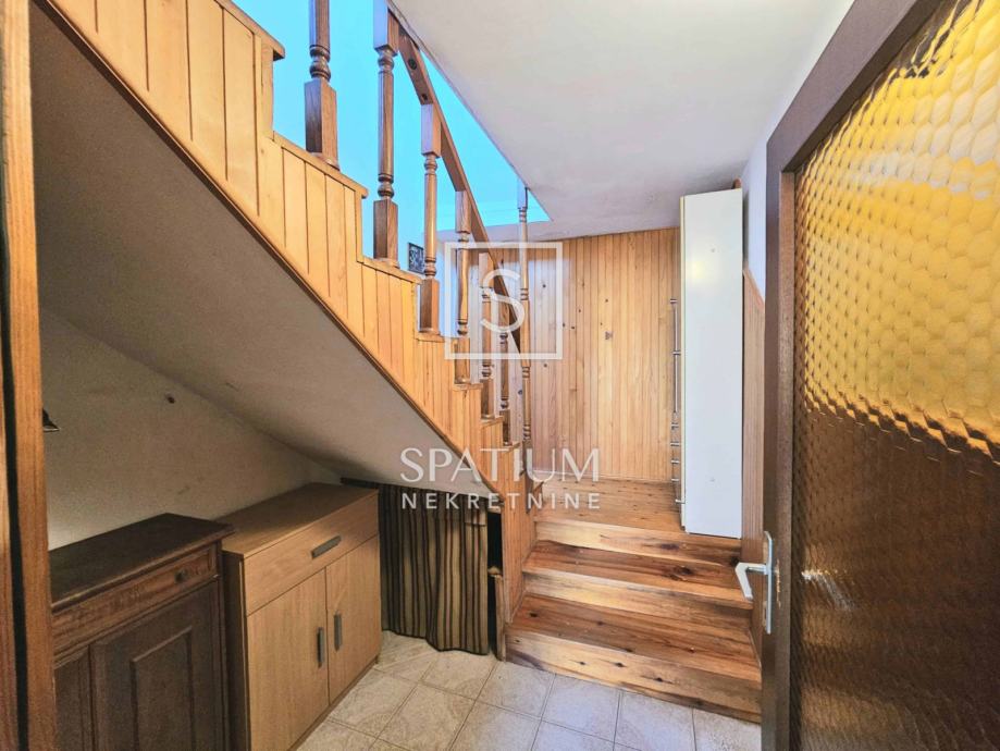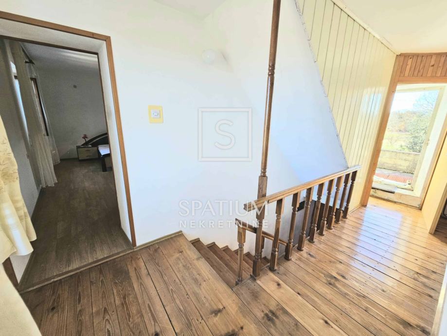 U prizemlju kuće su smješteni kuhinja, dnevni boravak, kupaonica a ulazni hodnik sa stepeništem vodi na kat.