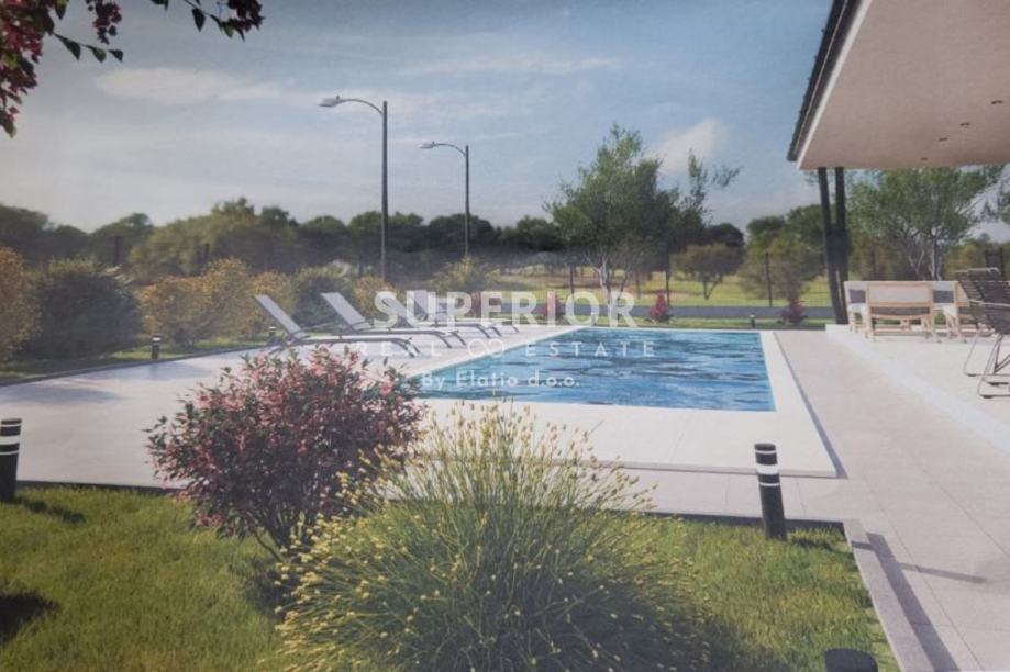Na okućnici se nalazi privatni bazen okružen sunčalištem, kao i tri parkirna mjesta. Moguće je dodatno urediti vrt ili postaviti ljetnu kuhinju. Kuća se nalazi u mirnom, obiteljskom okruženju, a istovremeno je izvrsno prometno povezana.